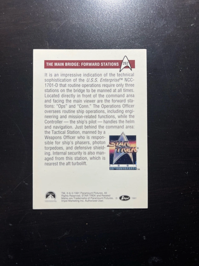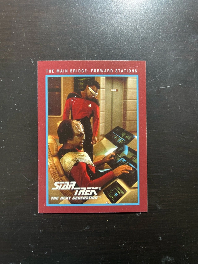 60This Star Trek: The Next Generation trading card from 1991, produced by Impel, features a vibrant image from "The Main Bridge: Forward Stations." Card number 262 is in good condition. A great addition to any Star Trek collection, this card captures a classic scene from the iconic series. These cards are becoming rare and hard to find. I have priced it according to other used collectable cards on Kijiji. If the ad is still up, then it is still available!
