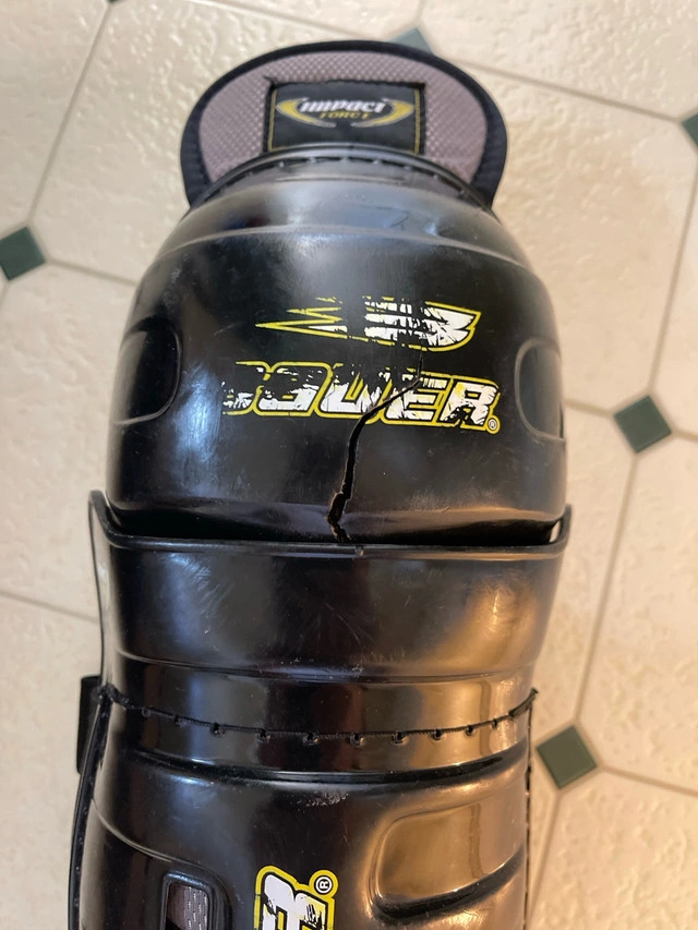 60I'm selling a used pair of Bauer Impact hockey shin guards, size 14 inches/36cm. These guards offer great protection and are perfect for any hockey player looking for reliable gear. The shin guards are used, showing some signs of wear, but are still in good condition and fully functional. Get ready to hit the ice with these durable Bauer shin guards! There is a crack in the plastic on the right shin at the knee however it doesn’t really make a big difference. * Brand: Bauer * Model: Impact * Size: 15 inches / 38 cm * Type: Shin Guards If the ad is still up, the shin guards are still available!