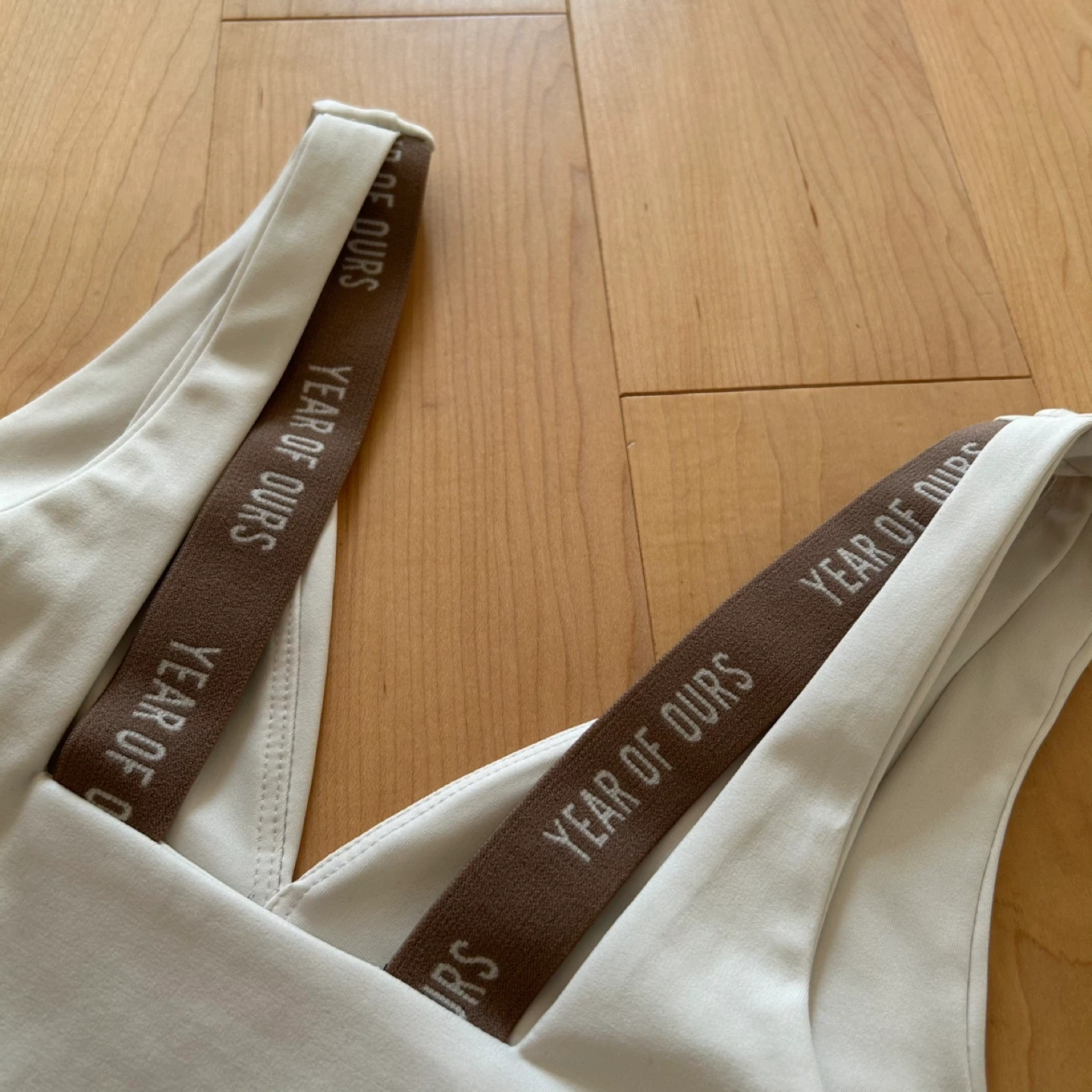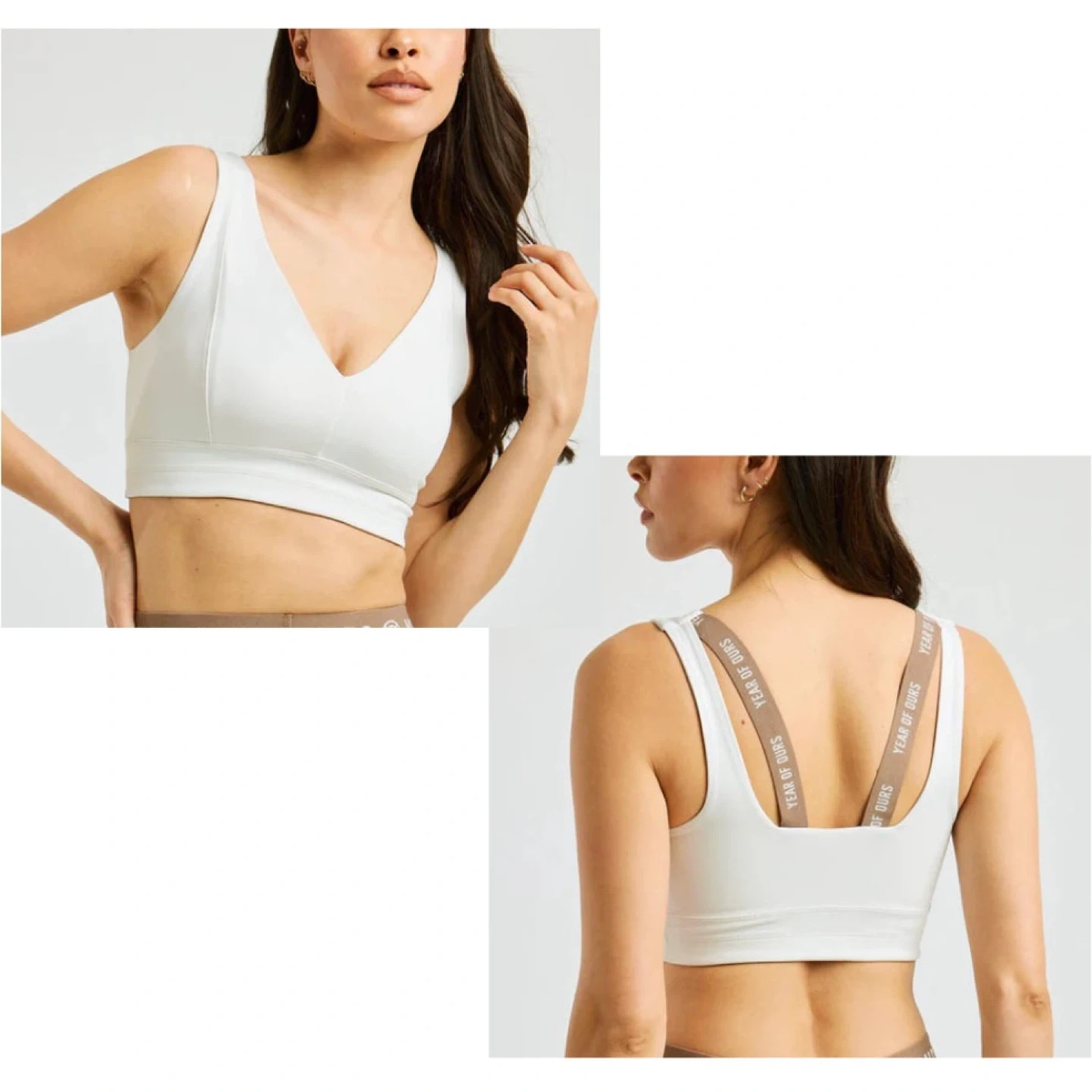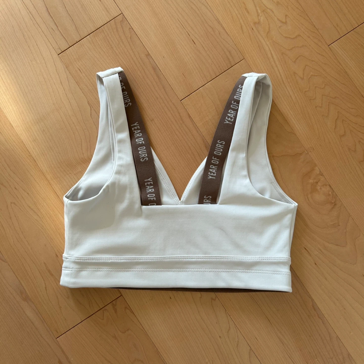 Year of Ours ‘Park Bra’ in ivory colour with V-neck front and contrast brown logo elastic details. No bra pads. Originally $58 USD, purchased from Bandier in NYC.