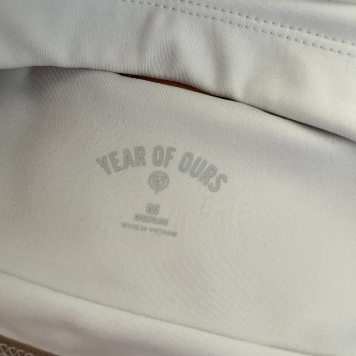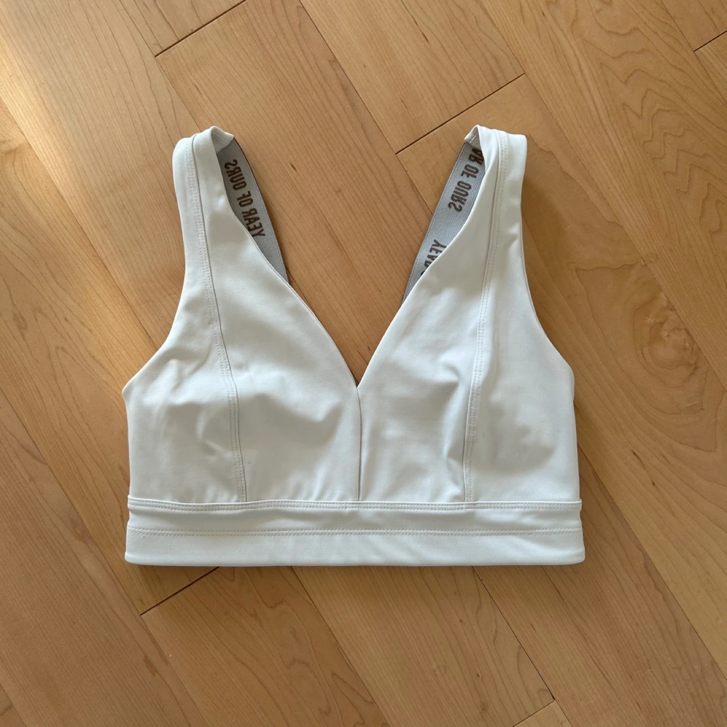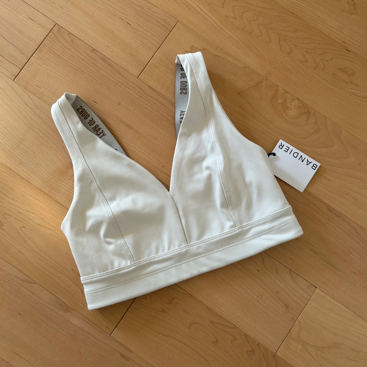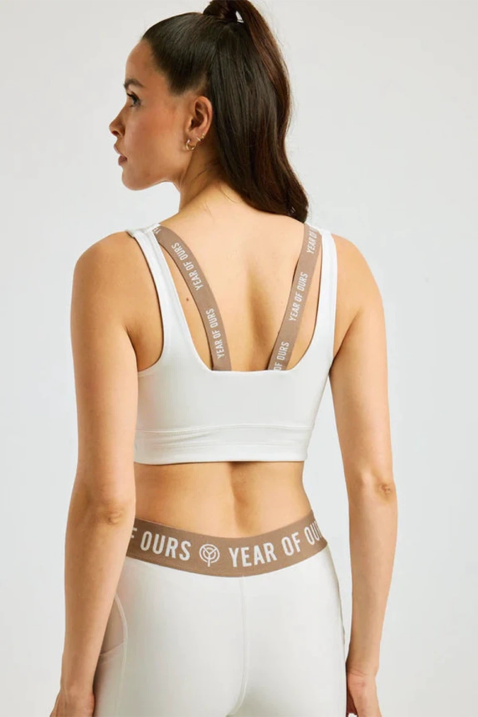 Year of Ours ‘Park Bra’ in ivory colour with V-neck front and contrast brown logo elastic details. No bra pads. Originally $58 USD, purchased from Bandier in NYC.