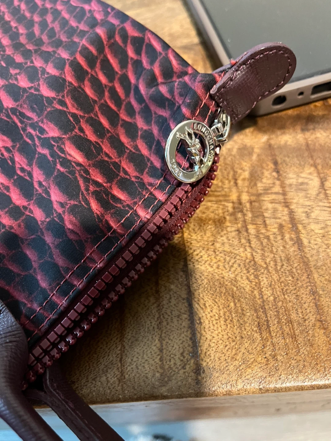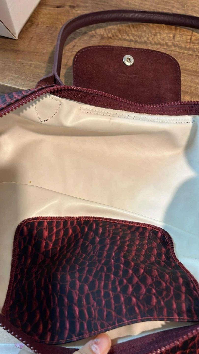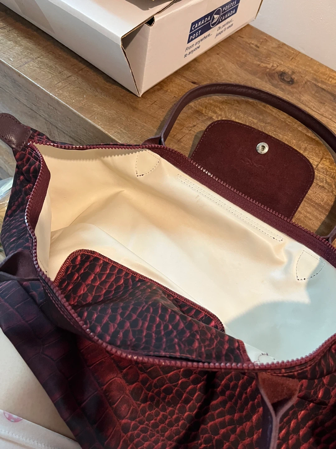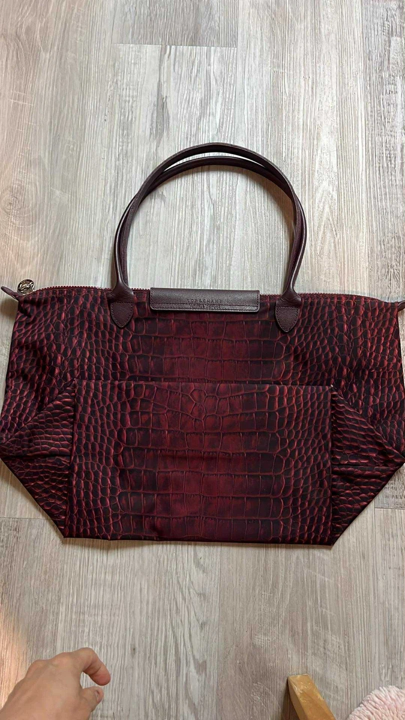 95This is a Pre loved Longchamp tote bag with a unique burgundy crocodile print. It's in great condition and ready for a new home! Perfect for everyday use or travel.