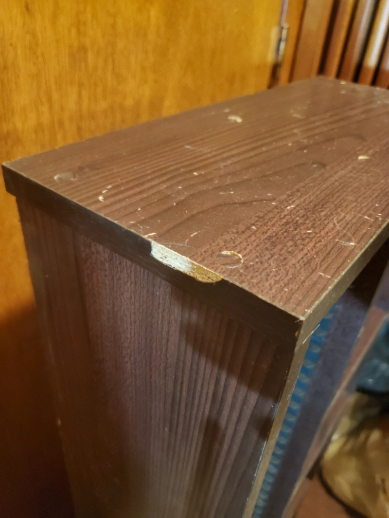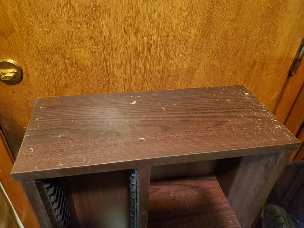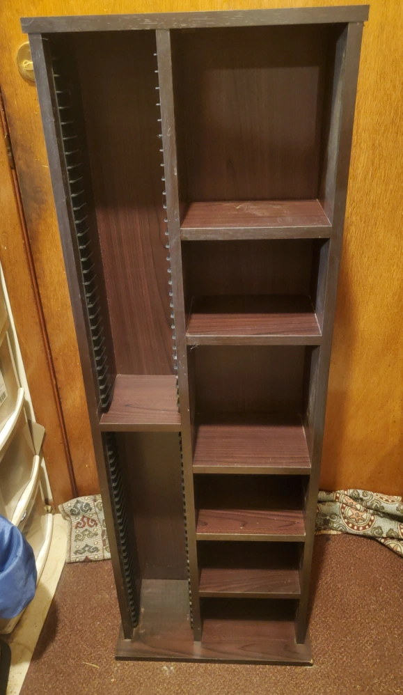 Selling a brown wooden shelf, perfect for storing CDs and DVDs. It has some shelves and a section for CDs. There are some signs of wear and tear on the top edges, as shown in the pictures.