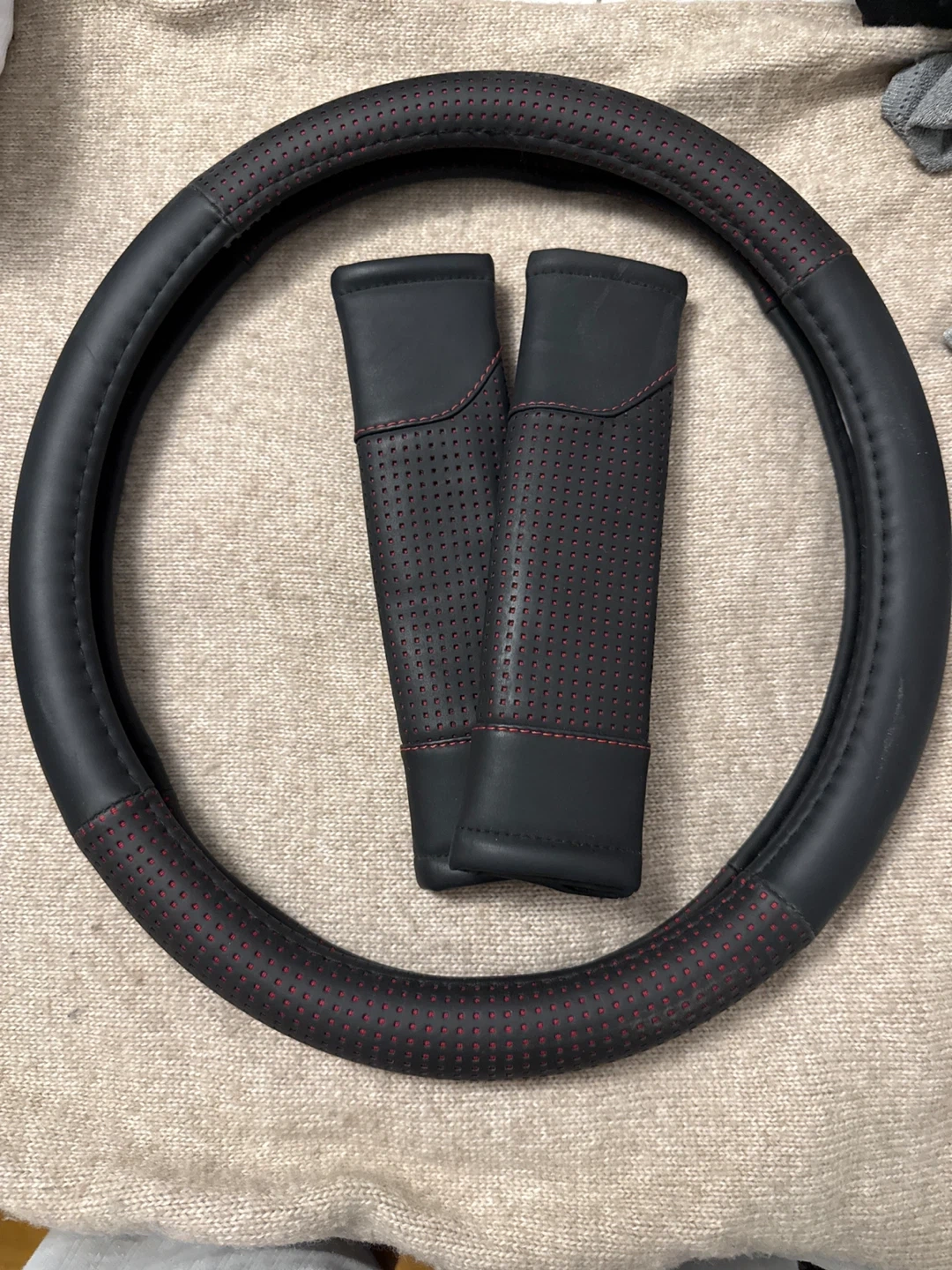 Selling a black leather steering wheel cover and a pair of matching seatbelt pads. The steering wheel cover has a perforated design with red stitching, providing a comfortable grip and a stylish look. The seatbelt pads offer extra cushioning for a more pleasant driving experience!