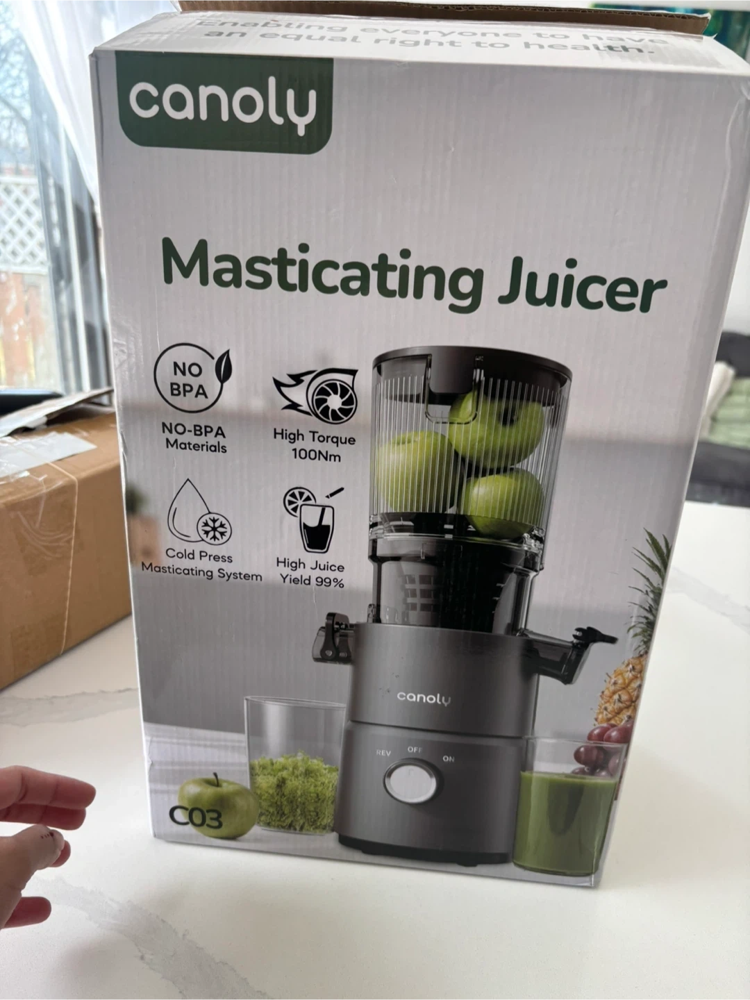 This is a Canoly masticating juicer in matte grey. It features a cold press masticating system for high juice yield. It's ideal for making fresh juices and nut milk. its NEW open box