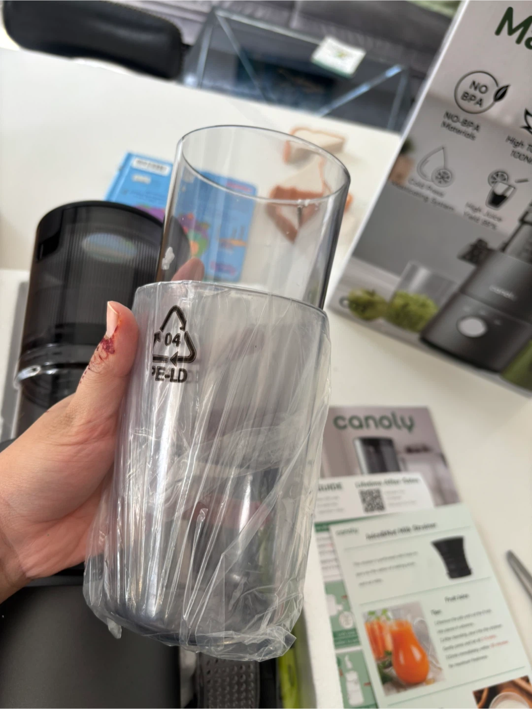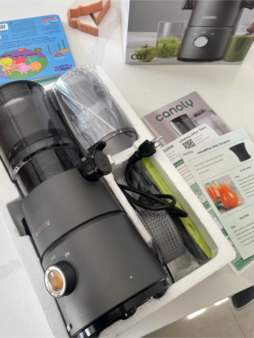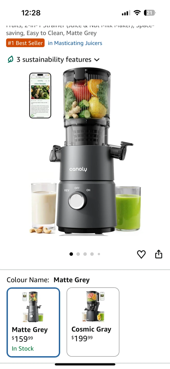 This is a Canoly masticating juicer in matte grey. It features a cold press masticating system for high juice yield. It's ideal for making fresh juices and nut milk. its NEW open box