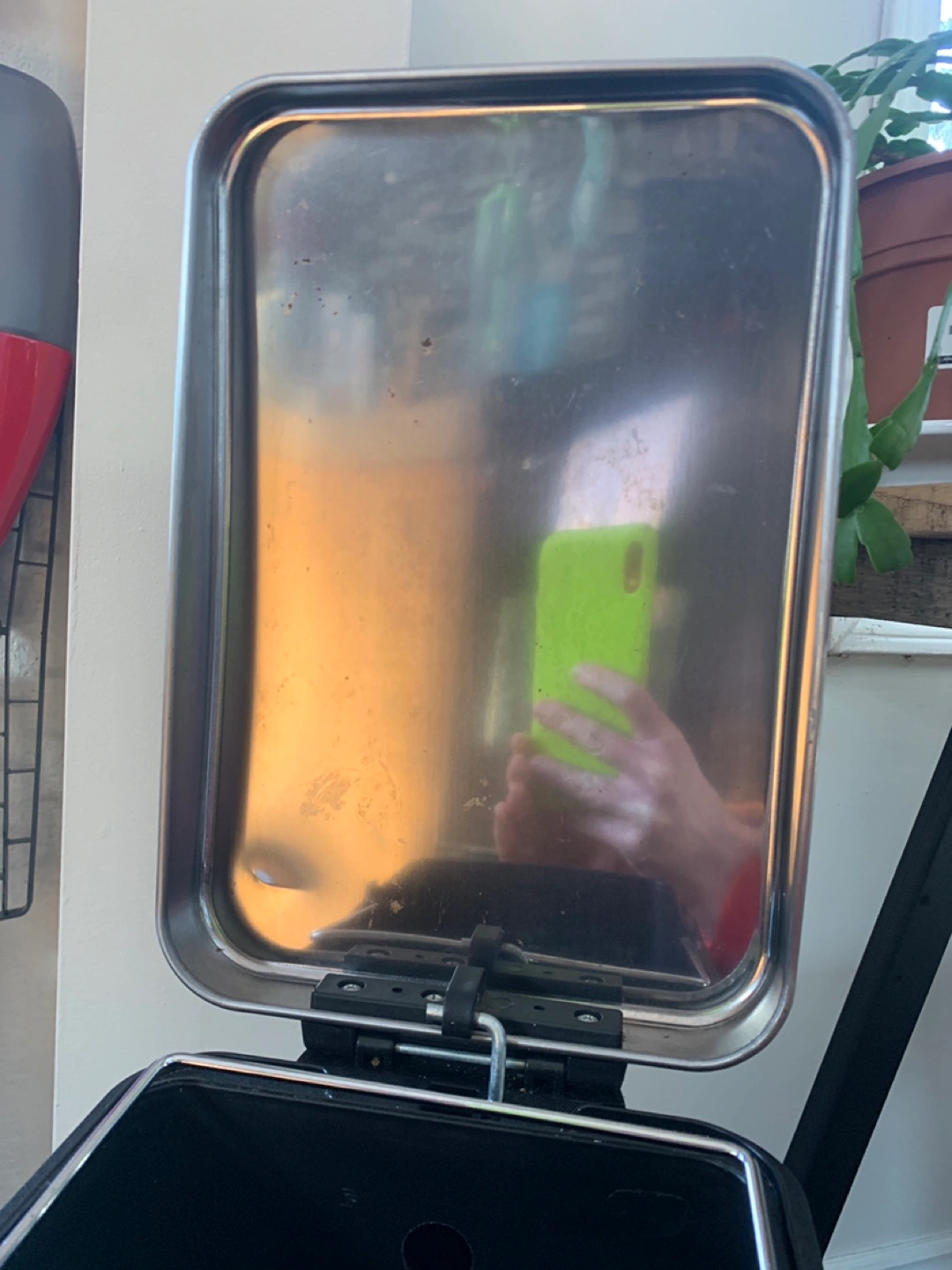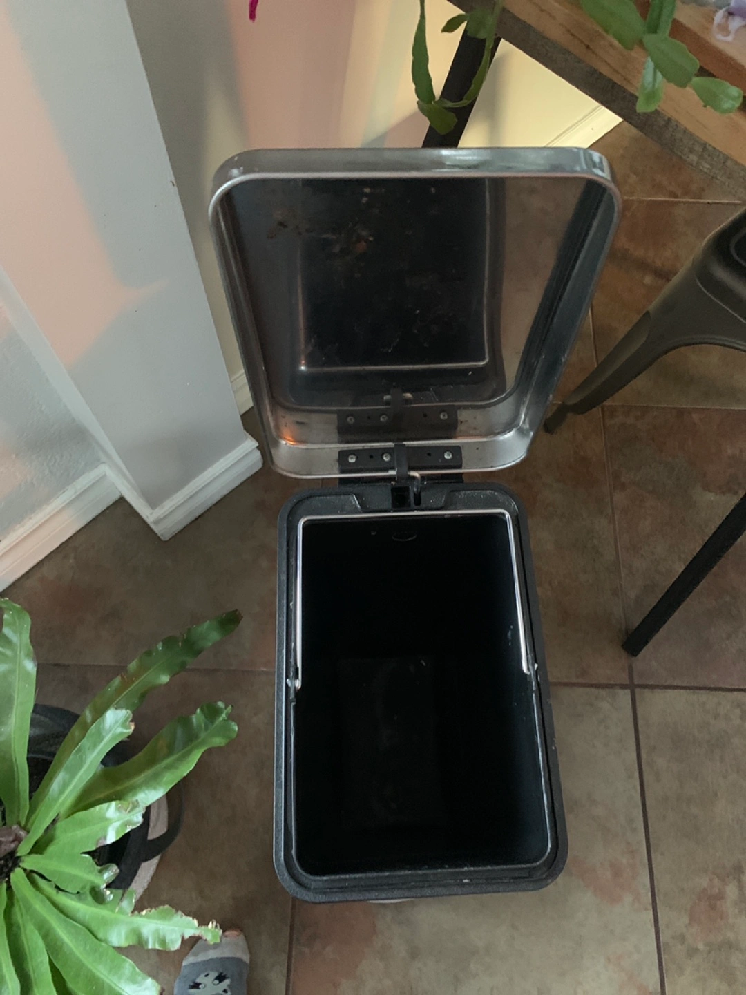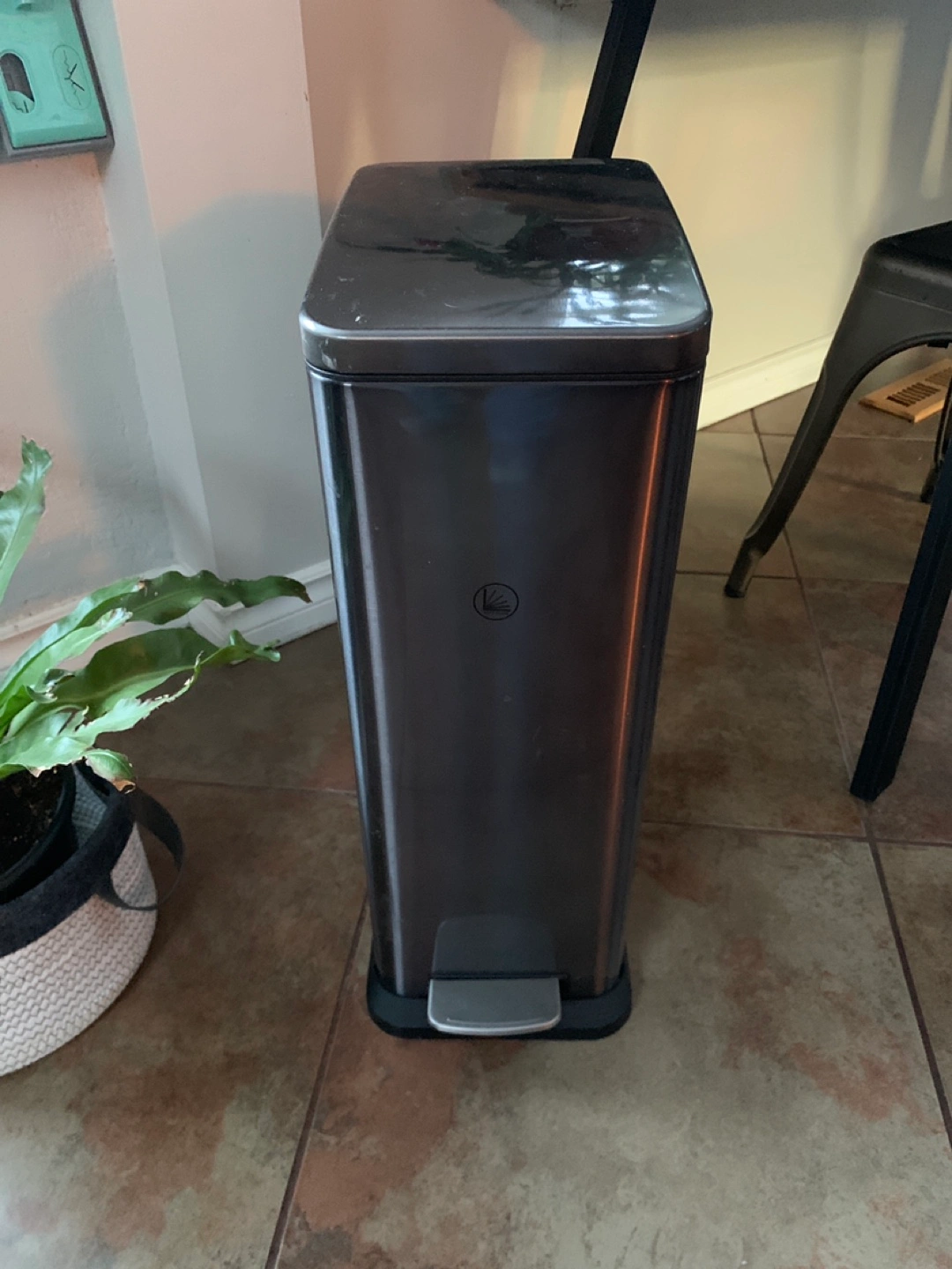 Sleek, rectangular step can. Black stainless steel finish. Foot pedal operation. Minor wear. Slams closed.