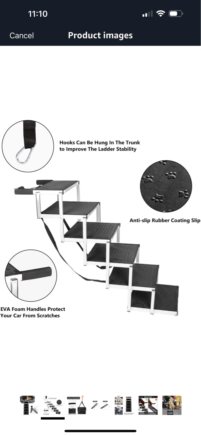 Four-step pet stairs. Collapsible design for easy storage. Features a carrying strap and non-slip rubber coating. Aluminium frame. Durable and lightweight.