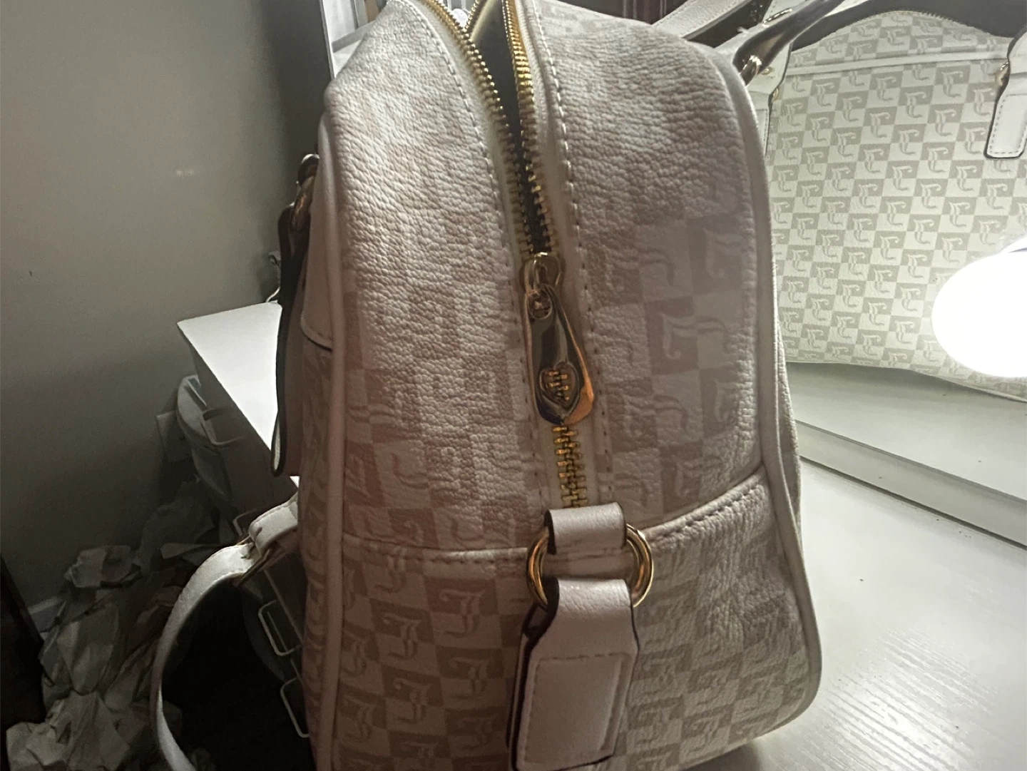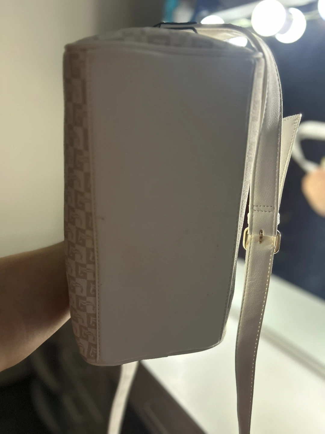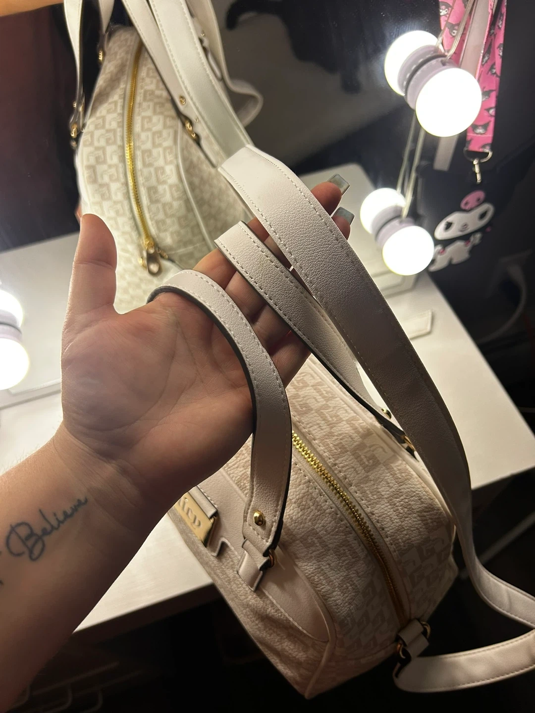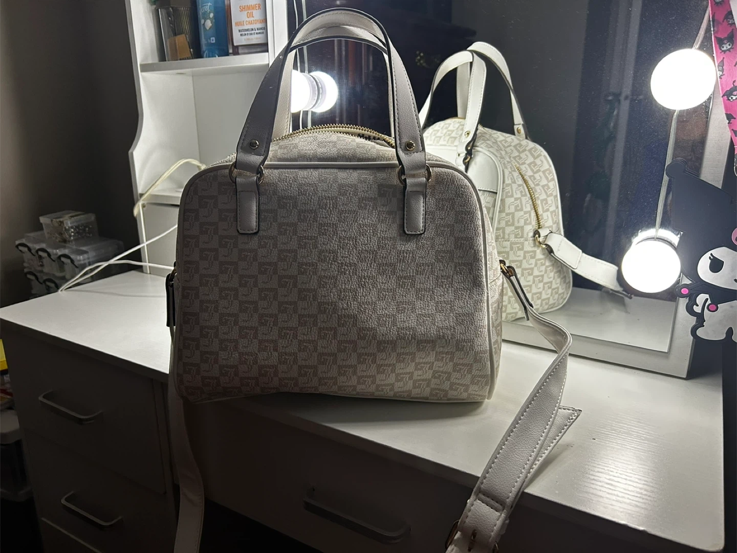 Brand new with tags, unused. Cream and white satchel with luxe logo print and gold metallic accents. Spacious interior with 1 zipper pocket and 2 pouches. Structured design with removable strap. Stylish, versatile.