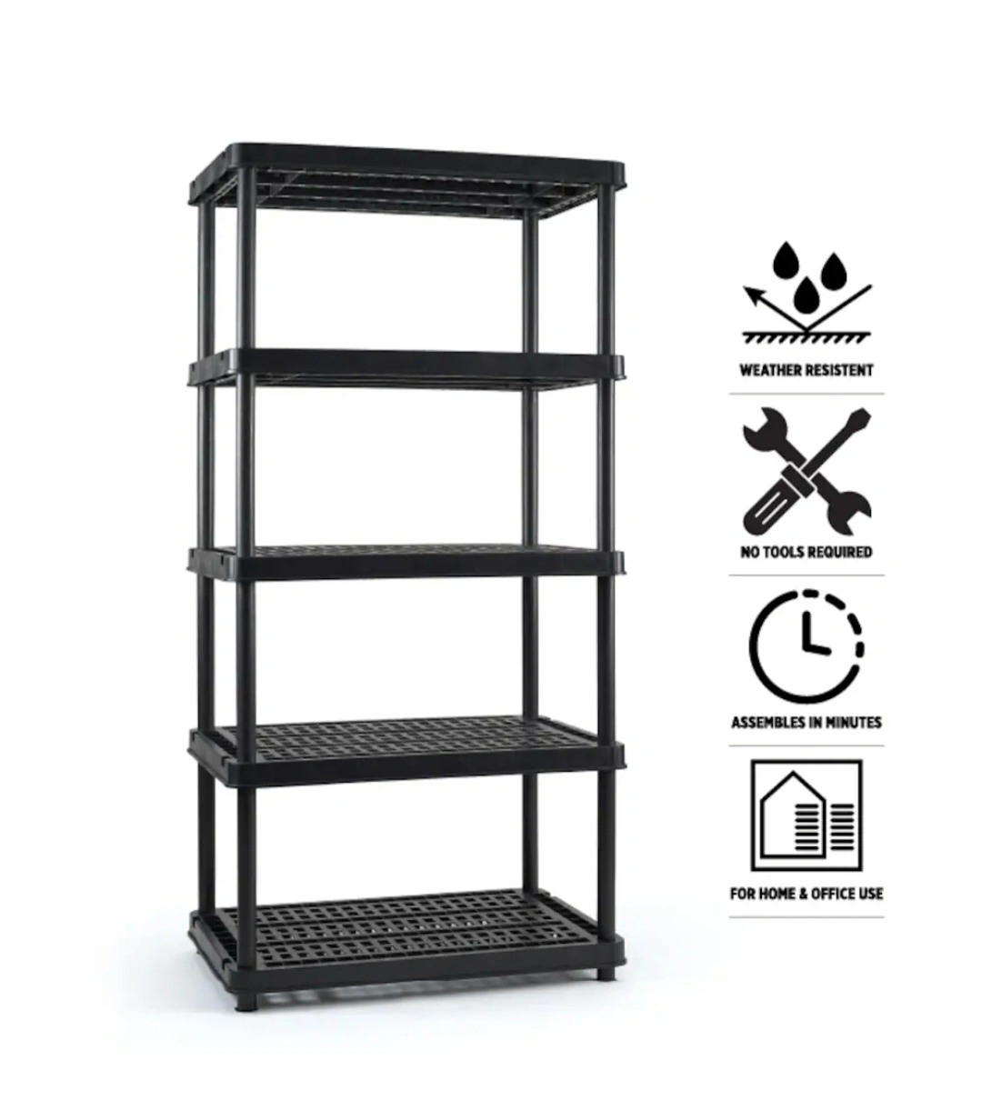 These black shelving unit are perfect for storage. They are weather-resistant, so it can be used indoors or outdoors. They assemble in minutes and require no tools. One leg has minor damage. It all works well and is intact. The dimensions are approximately 72" tall, 36" wide, and 18" deep. Two for the price of one. Photos are from store where originally purchased (Home Depot).