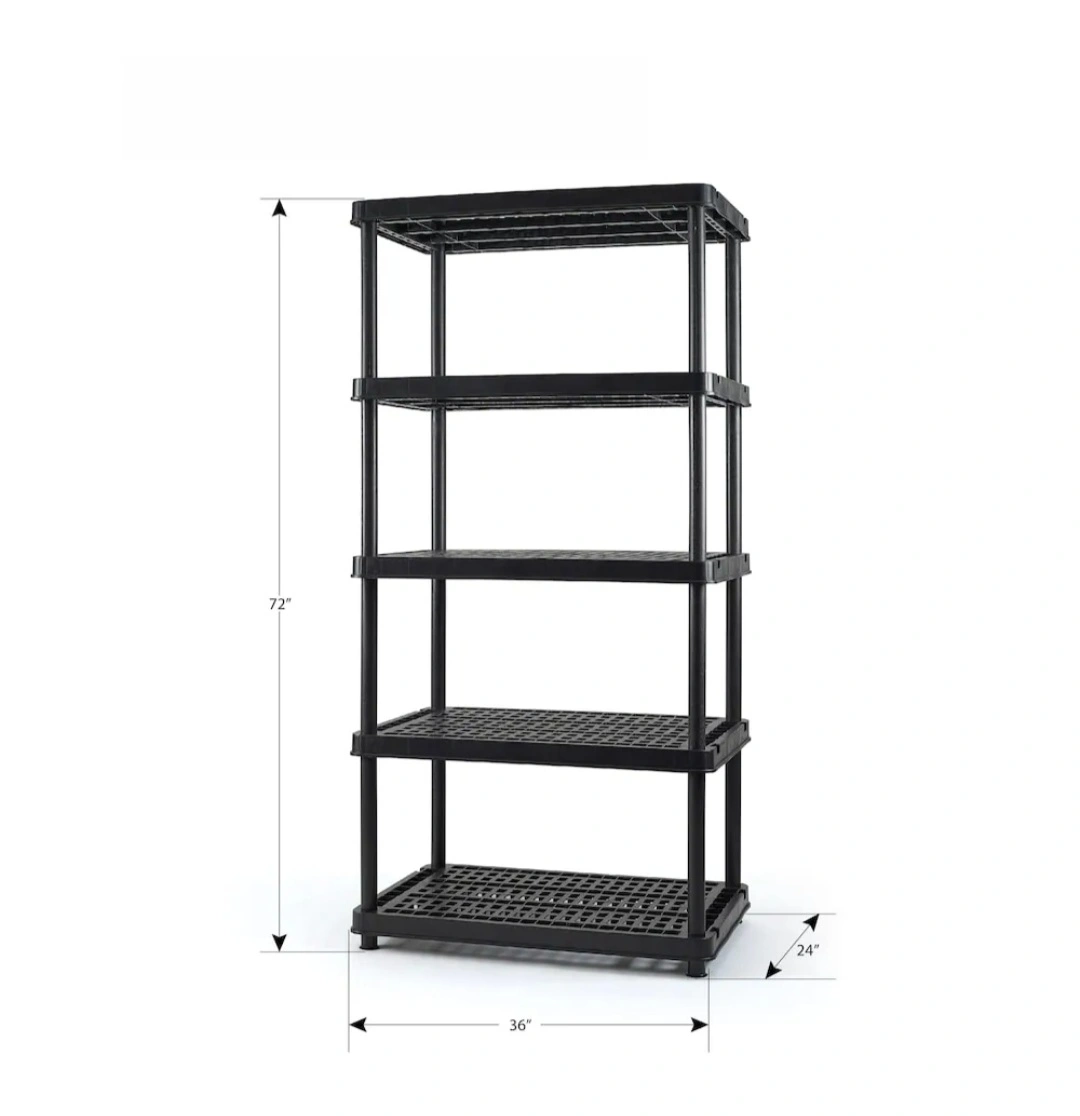 These black shelving unit are perfect for storage. They are weather-resistant, so it can be used indoors or outdoors. They assemble in minutes and require no tools. One leg has minor damage. It all works well and is intact. The dimensions are approximately 72" tall, 36" wide, and 18" deep. Two for the price of one. Photos are from store where originally purchased (Home Depot).