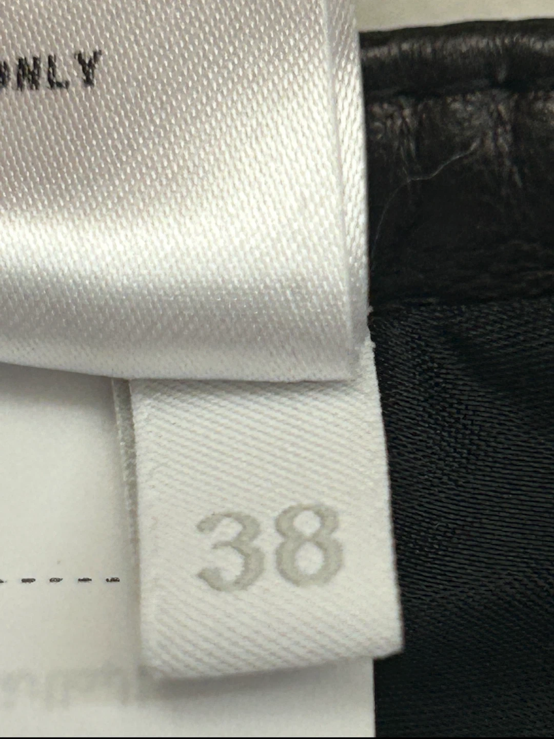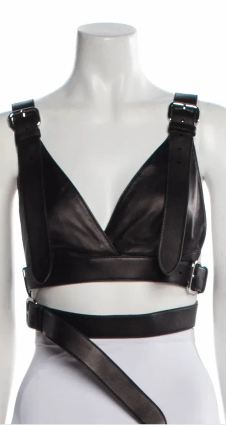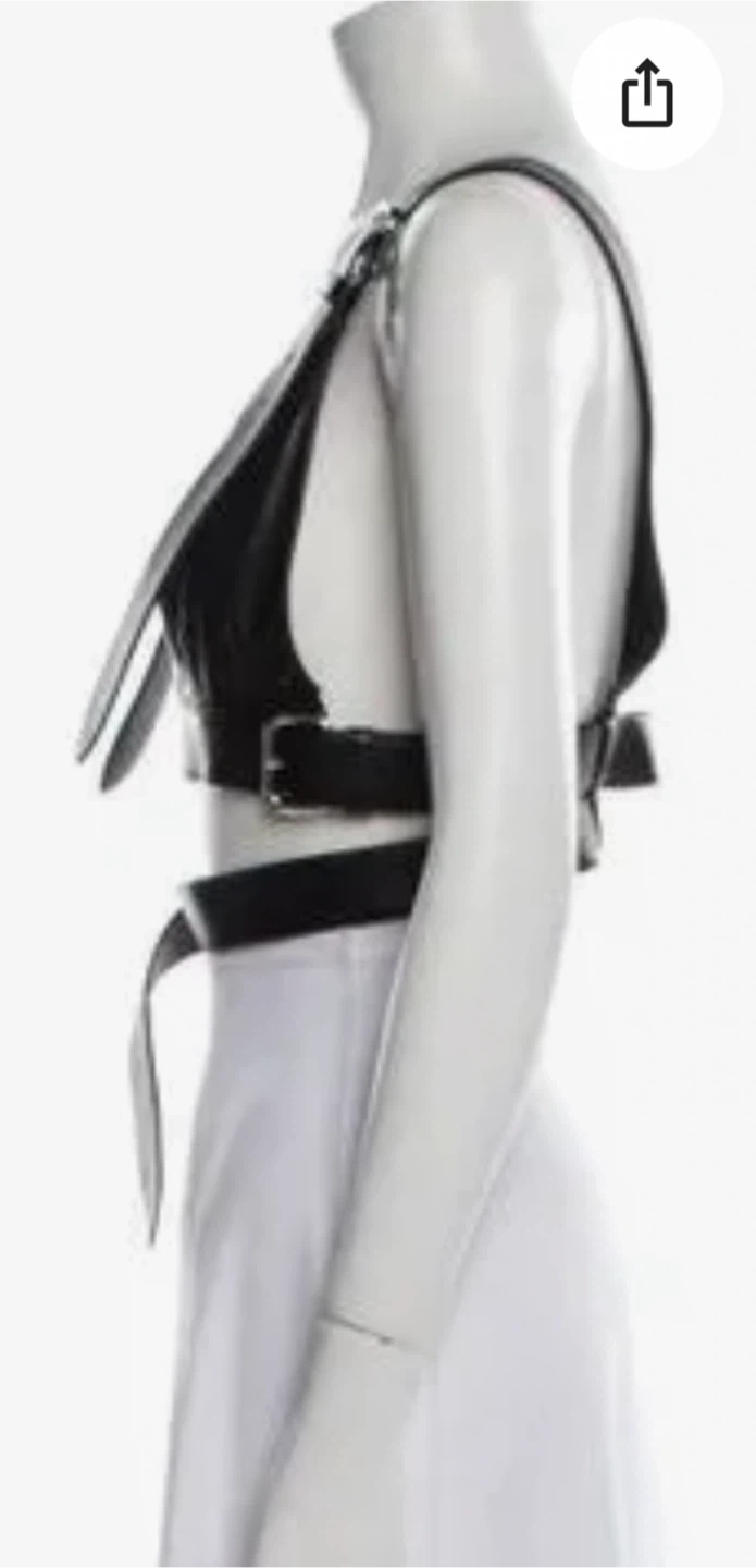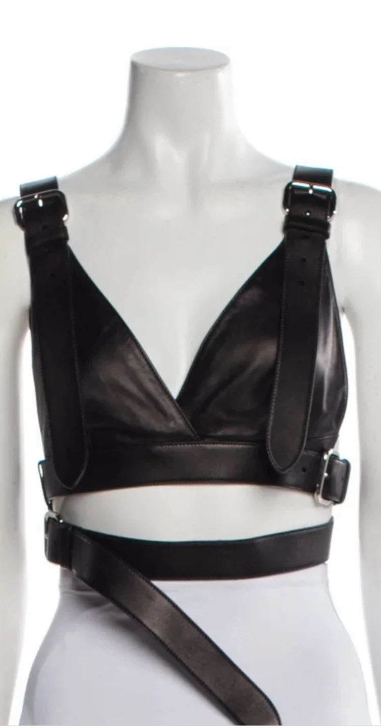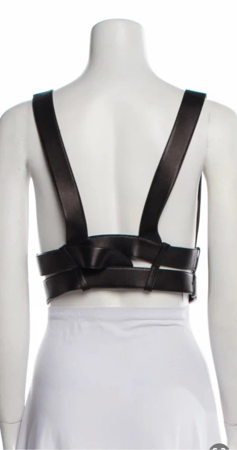 Selling a Miu Miu black leather harness bra top in size 38. It's a unique piece that adds a stylish edge to any outfit! The material is leather, giving it a sleek and sophisticated look.