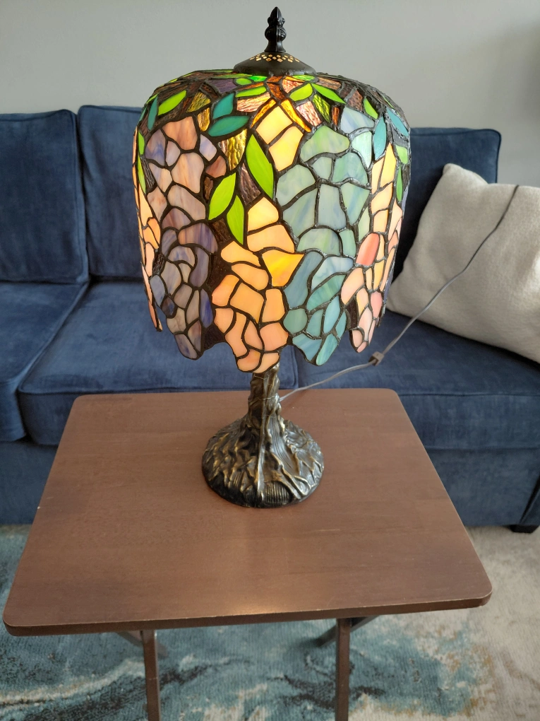 Selling a table lamp with a stained glass shade. The base has a bronze style finish and the shade features and abstract floral design with various colours.