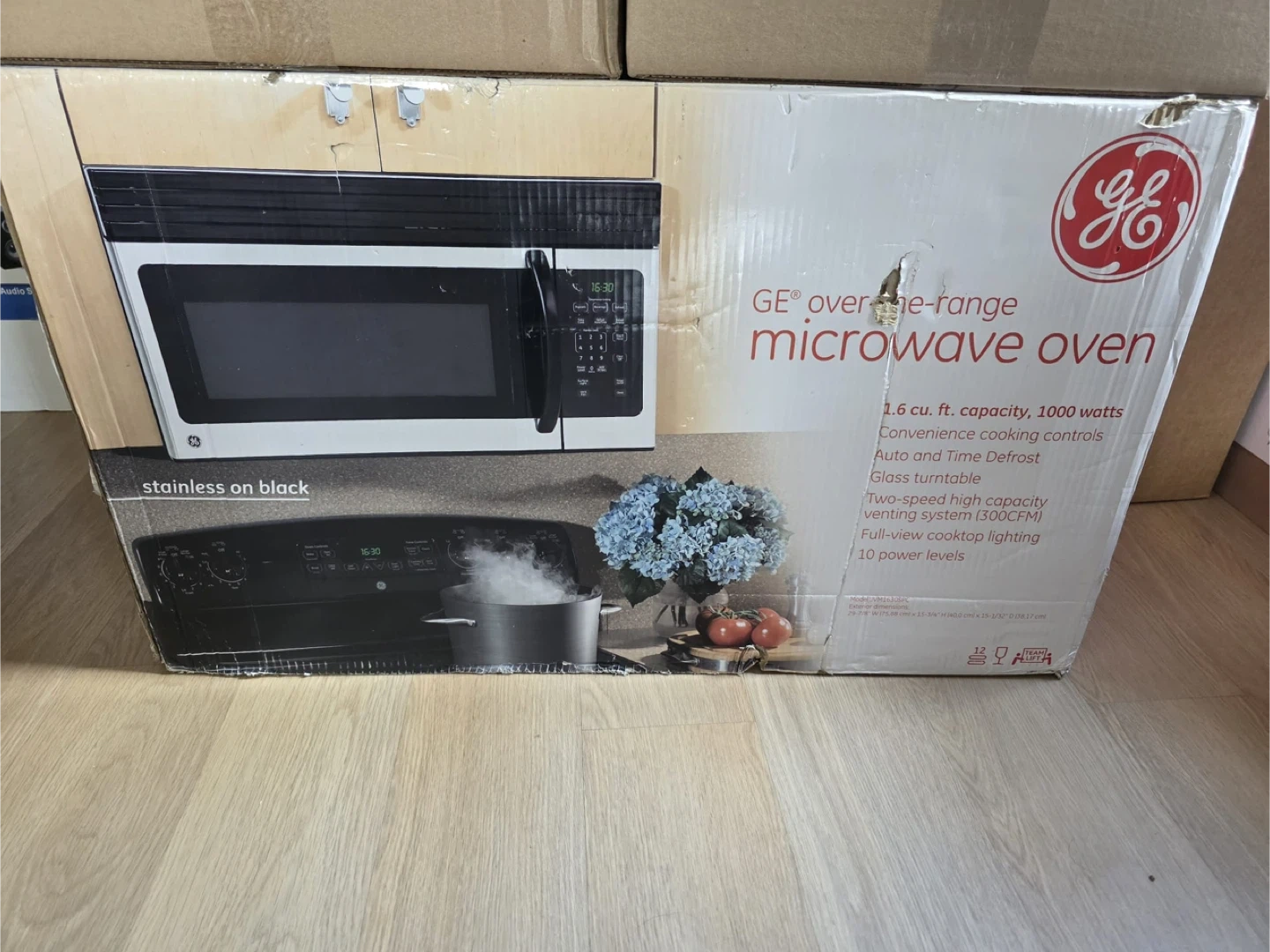 Selling a GE over-the-range microwave oven in stainless on black. It has a 1.6 cu ft capacity and 1000 watts of power. This microwave features convenience cooking controls, auto and time defrost, and a glass turntable. It also includes a two-speed high capacity venting system (300CFM) and full-view cooktop lighting with 10 power levels