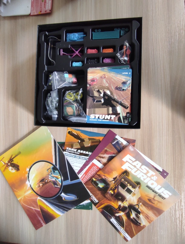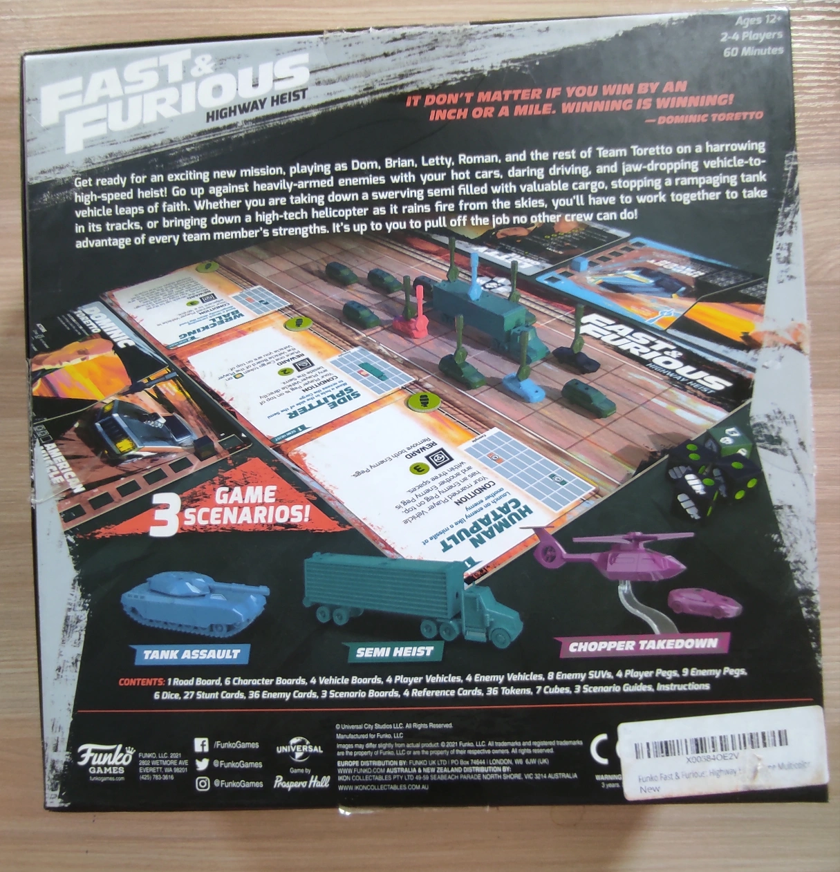 Get ready for an exciting new mission playing as Dom, Brian, Letty, Roman, and the rest of Team Toretto in a cooperative strategy game! Ages 12+, 2-4 players, and about 60 minutes to play. Includes 6 road boards, 4 vehicle boards, 4 player vehicles, 4 enemy vehicles, 4 enemy SUVs, 4 player pegs, 9 enemy pegs, 6 dice, 27 stunt cards, 36 enemy cards, 3 scenario boards, 4 reference cards, 36 tokens, 7 cubes, and instructions