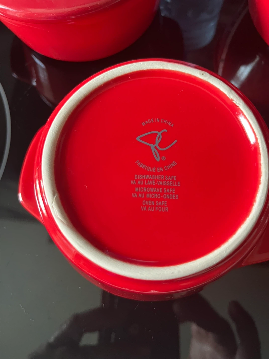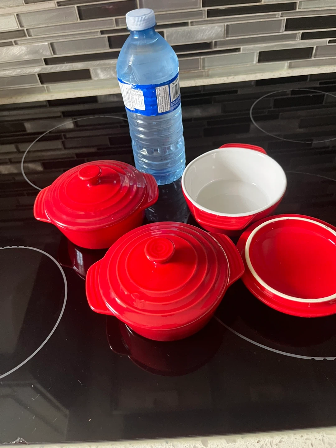Selling a set of 4 red ramekins, each with its own lid! These are perfect for individual desserts, dips, or even just for portion control. They're in great shape and ready for a new home. They are dishwasher, microwave, and oven safe