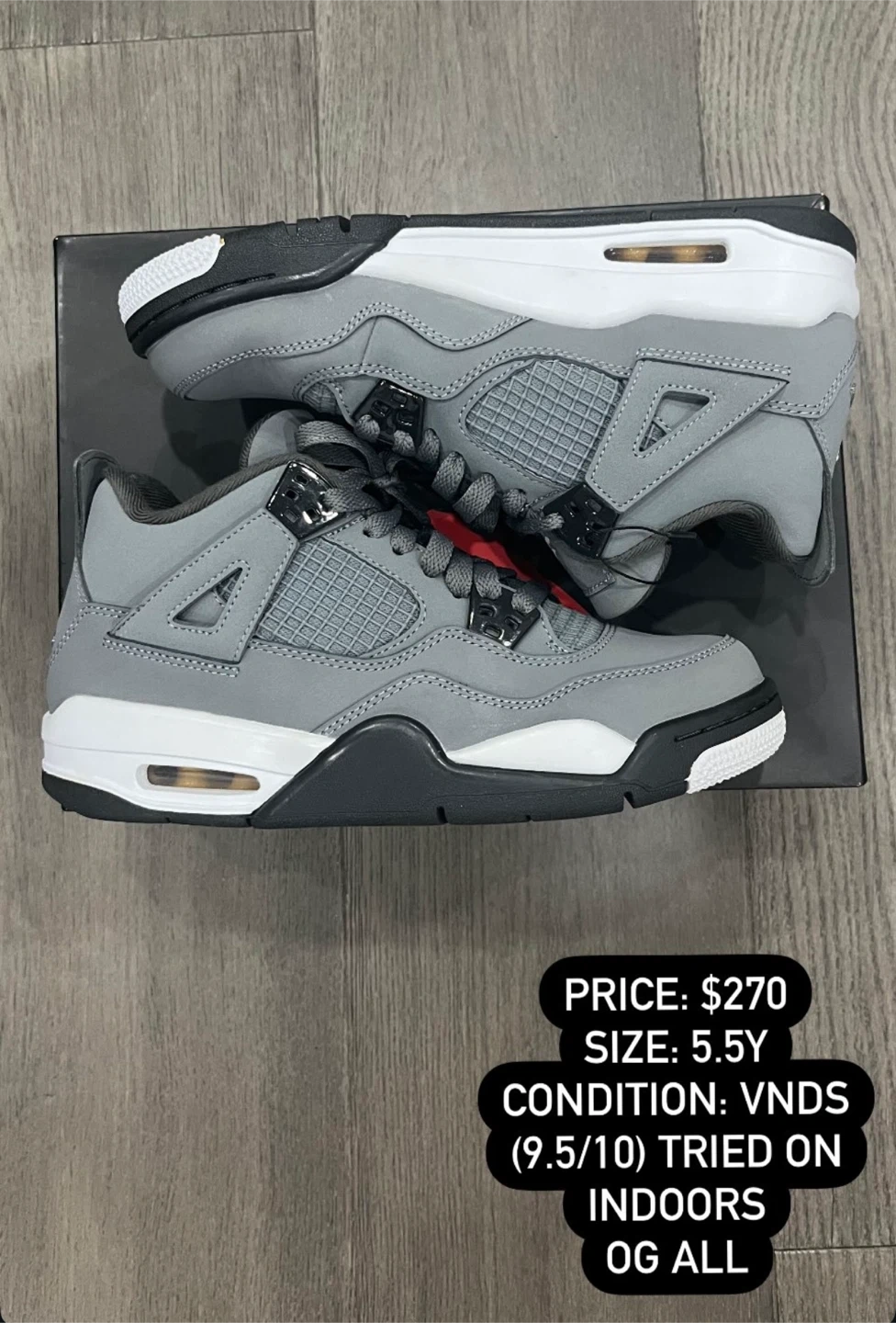 Selling a pair of Nike Air Jordan 4 Retro sneakers in size 5.5Y. They are in very near deadstock condition (VNDS), rated 9.5/10. They have only been tried on indoors and come with the original box and all accessories (OG ALL). Originally priced at $270.