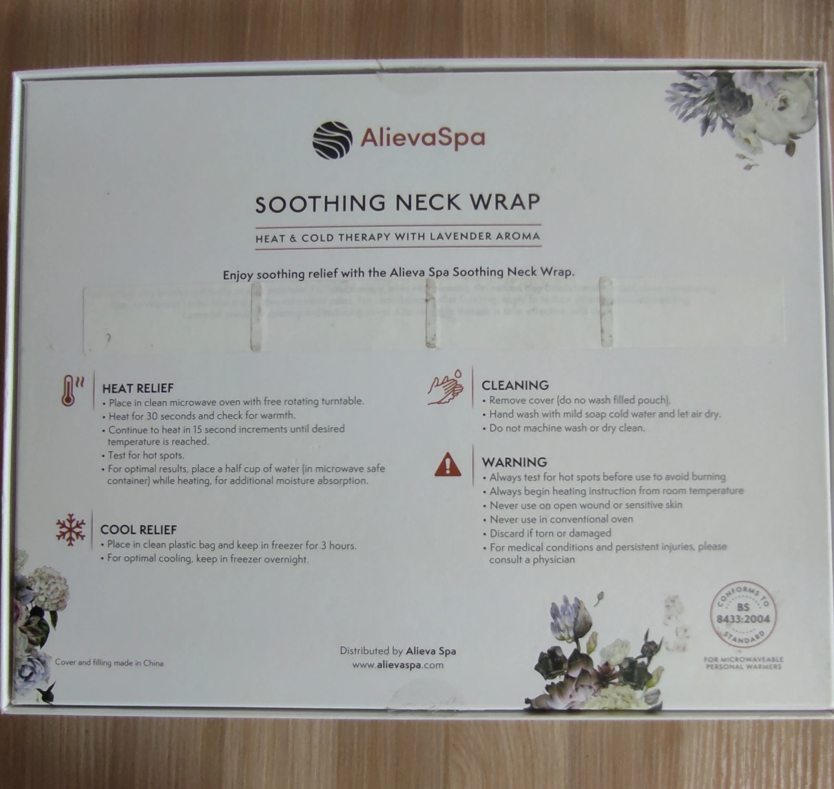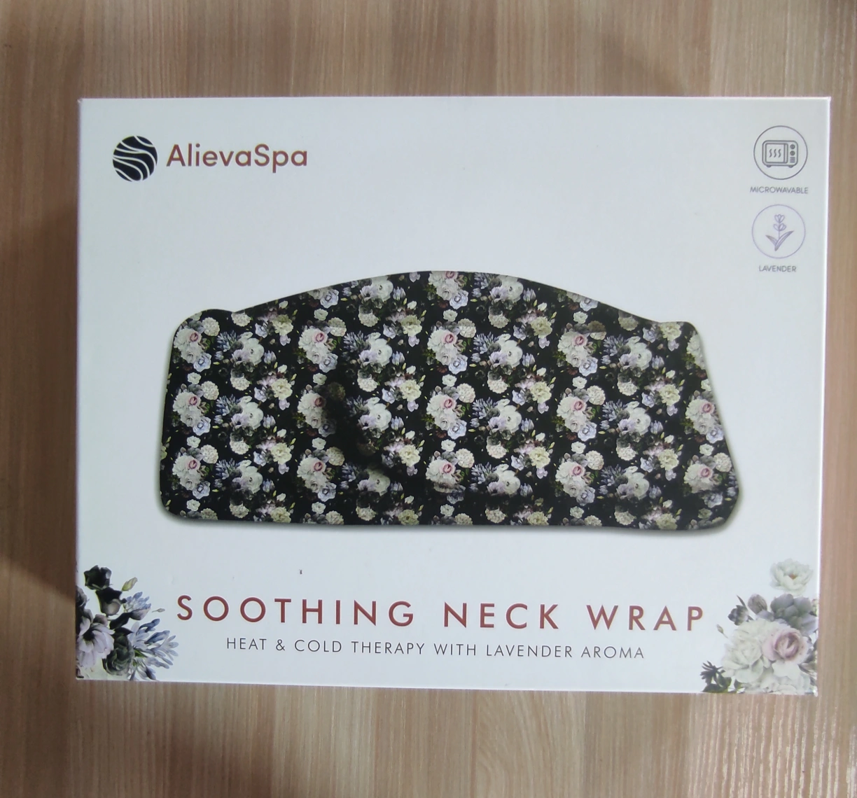 15This AlievaSpa Soothing Neck Wrap offers heat and cold therapy with a lovely lavender aroma. It features a beautiful floral pattern. Enjoy soothing relief with this neck wrap. It can be used for heat relief by microwaving or for cool relief by placing it in the freezer. The box is included, and it also includes instructions for heat relief, cool relief, and cleaning