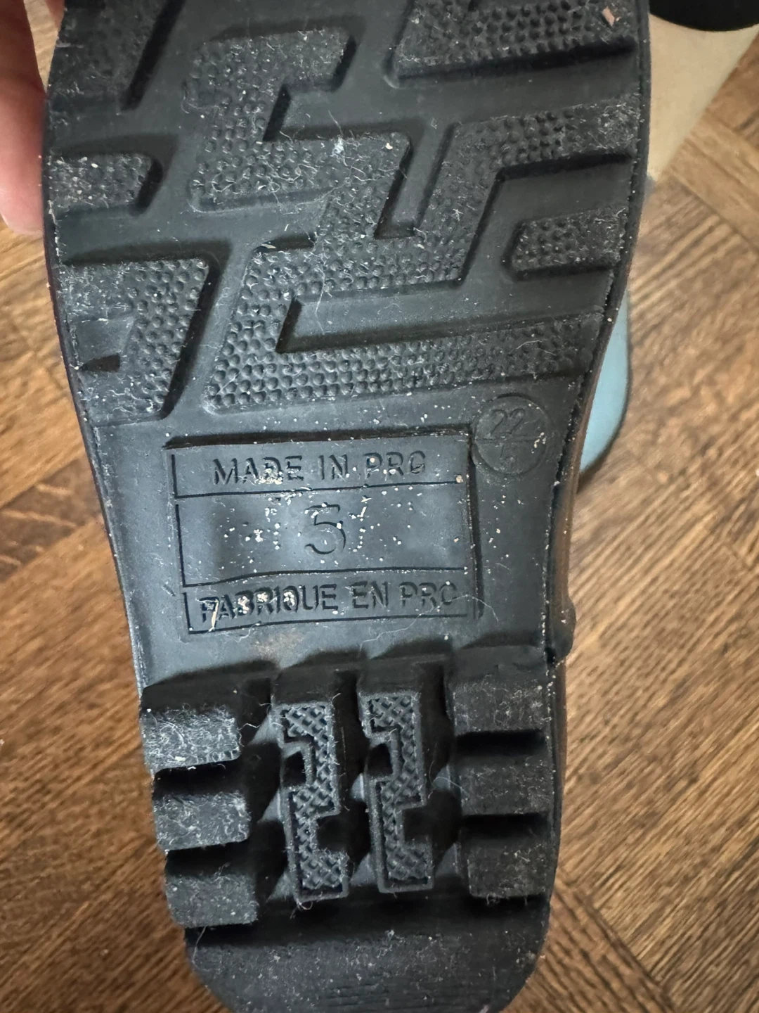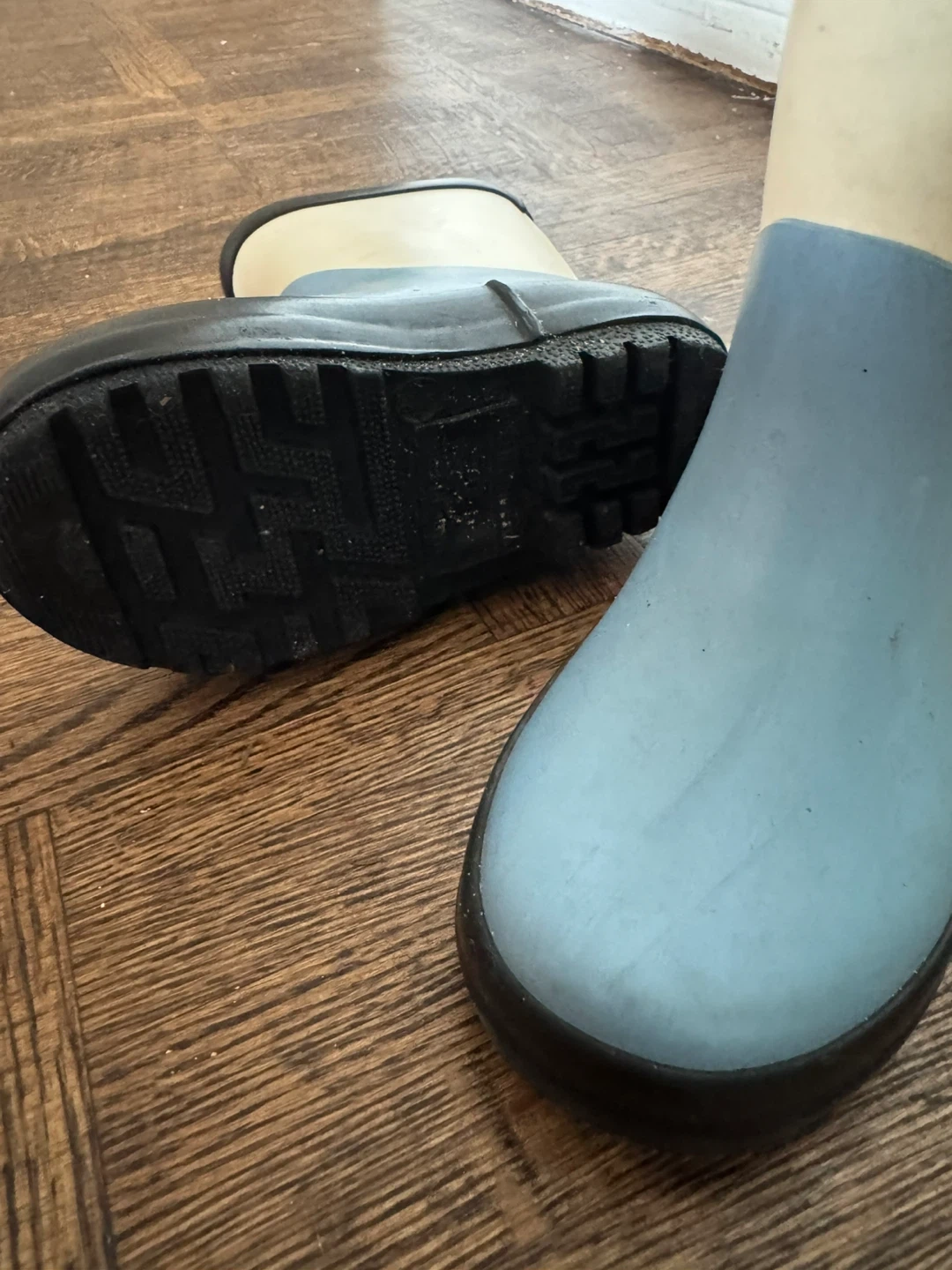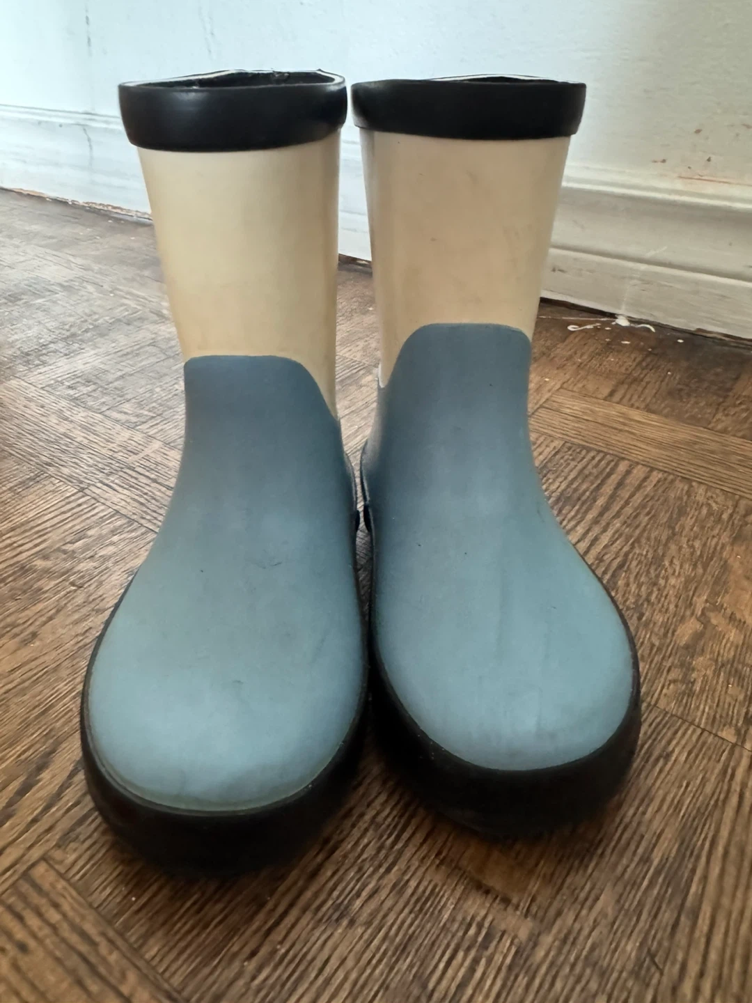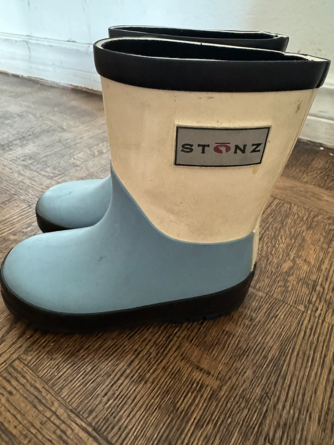 Selling a pair of gently used Stonz rain boots. They are size 5 and feature a light blue and beige colour scheme. Perfect for keeping little feet dry on rainy days!