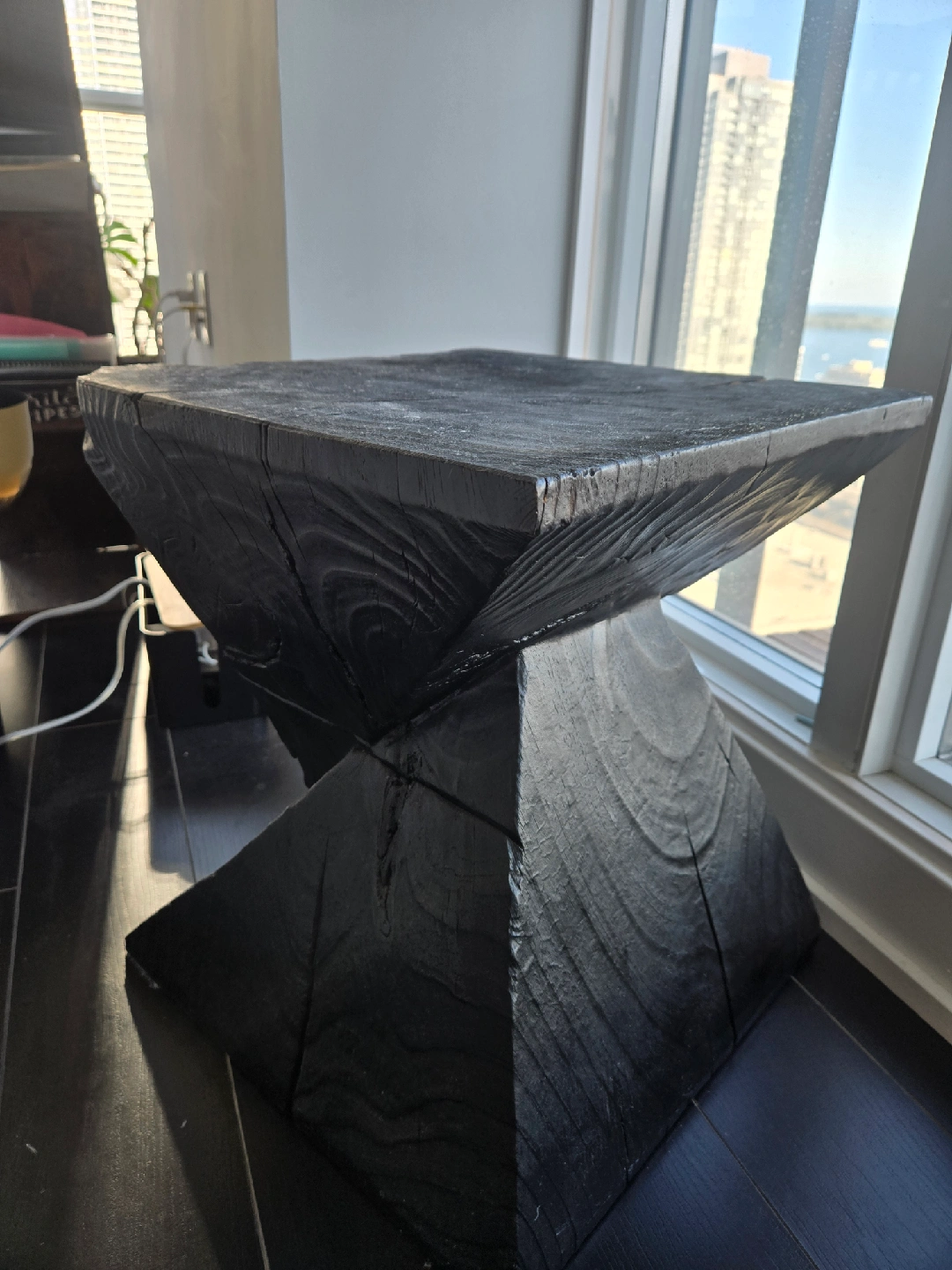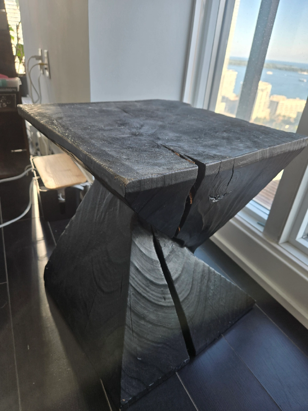 Selling a unique carbonized wooden accent table! It would look great in a living room or bedroom as a side table or plant stand. The wood grain gives it a rustic, natural feel that would complement many decor styles