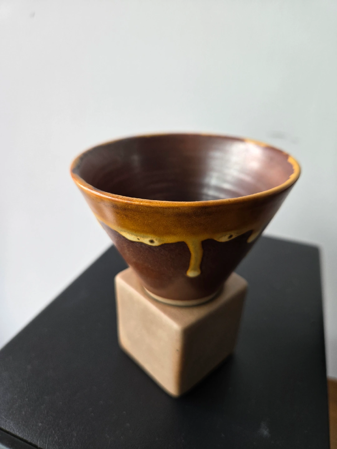 128Selling a unique brown ceramic cup that comes with its own stand! It's in great condition and would look lovely as a decorative piece or for holding small items. The bowl has a glazed finish with a drip effect around the rim, adding a touch of character to any space 4.5"