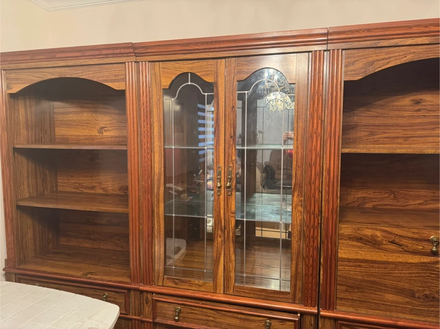 Selling a beautiful wooden china cabinet! It features glass doors on the upper section and ample storage space below. The wood has a lovely grain and warm tone, perfect for adding a touch of elegance to your dining room or living space