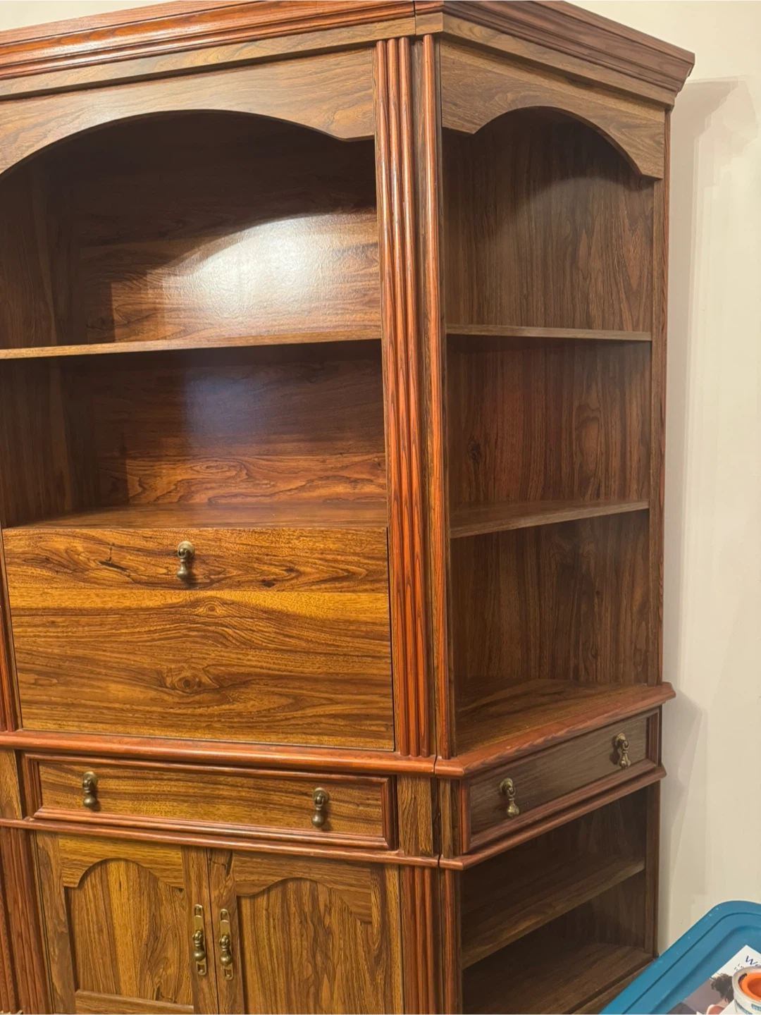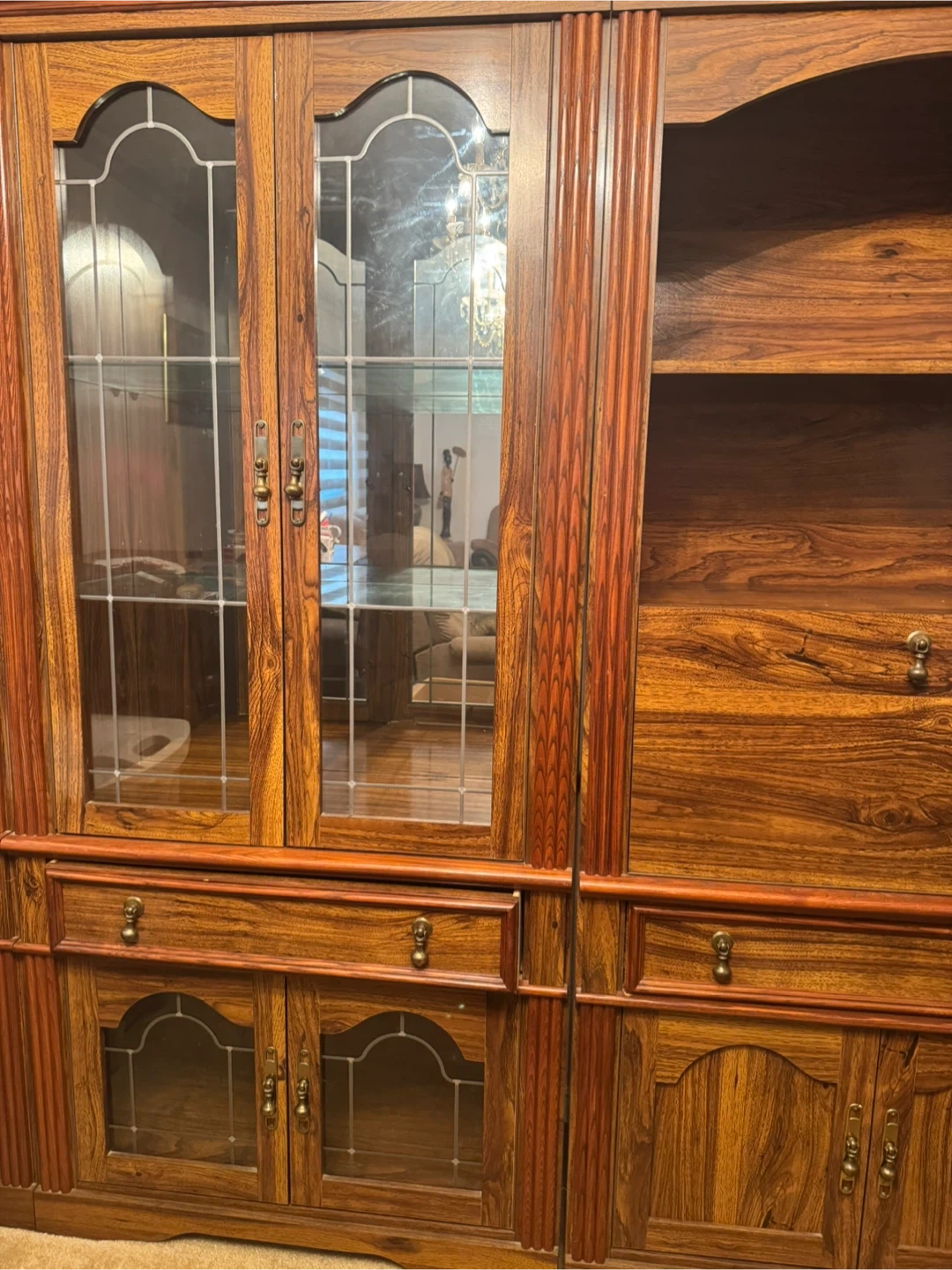 Selling a beautiful wooden china cabinet! It features glass doors on the upper section and ample storage space below. The wood has a lovely grain and warm tone, perfect for adding a touch of elegance to your dining room or living space
