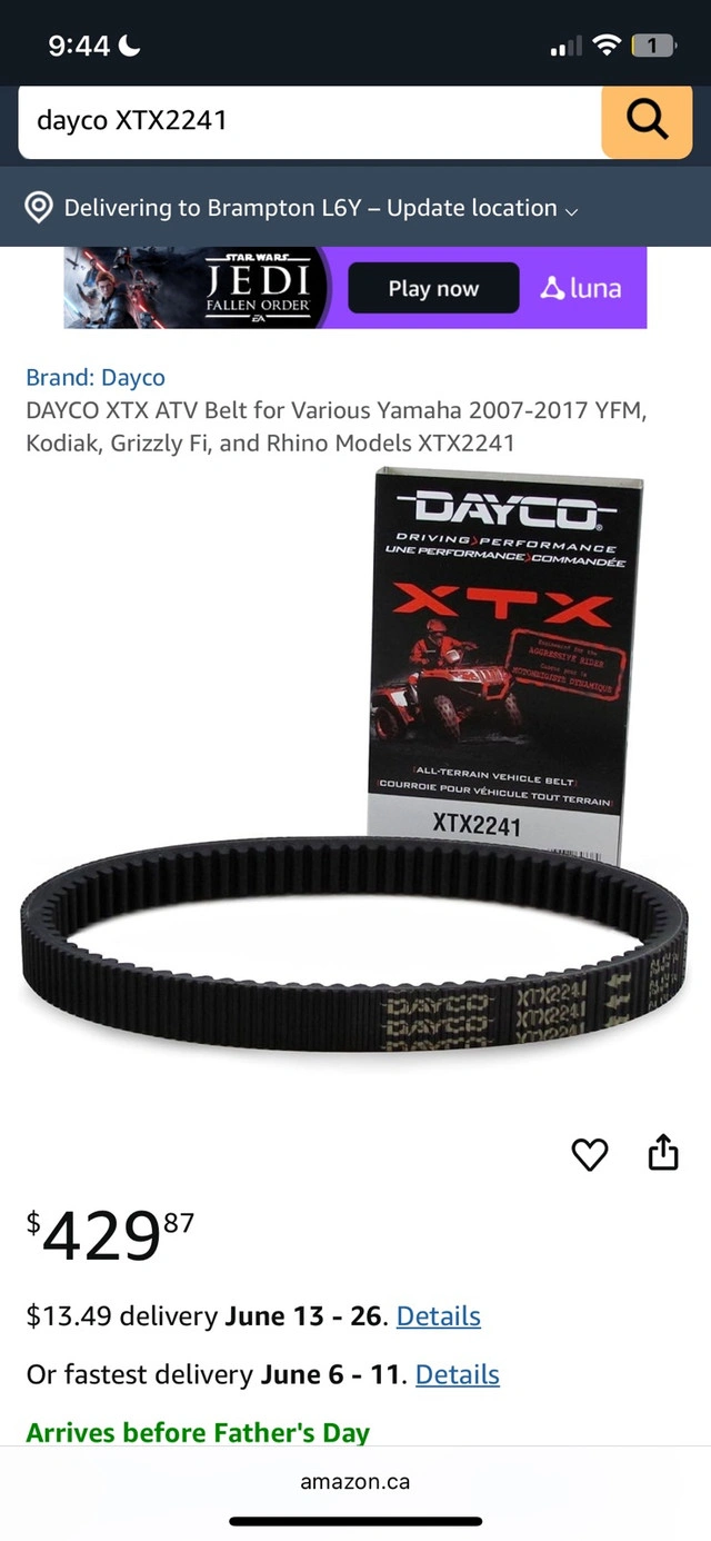New Dayco XTX2241 all-terrain vehicle drivebelt, designed for optimal performance and durability in all conditions. The belt is brand new in the original packaging. Specifications: * Brand: Dayco * Part Number: XTX2241 * Type: All-Terrain Vehicle Belt DAYCO XTX ATV Belt for Various Yamaha 2007-2017 YFM, Kodiak, Grizzly Fi, and Rhino Models Fits Yamaha 600/660 Grizzly 1998-2006, 660 Rhino 2004-2007, 700 Grizzly 2007-2009, 700 Rhino 2008-2009 ATV enthusiasts, take note: if the ad is up, the belt is available! Selling for half price. Price firm Pickup can be arranged in Brampton, Mississauga, Oakville, Burlington, Hamilton