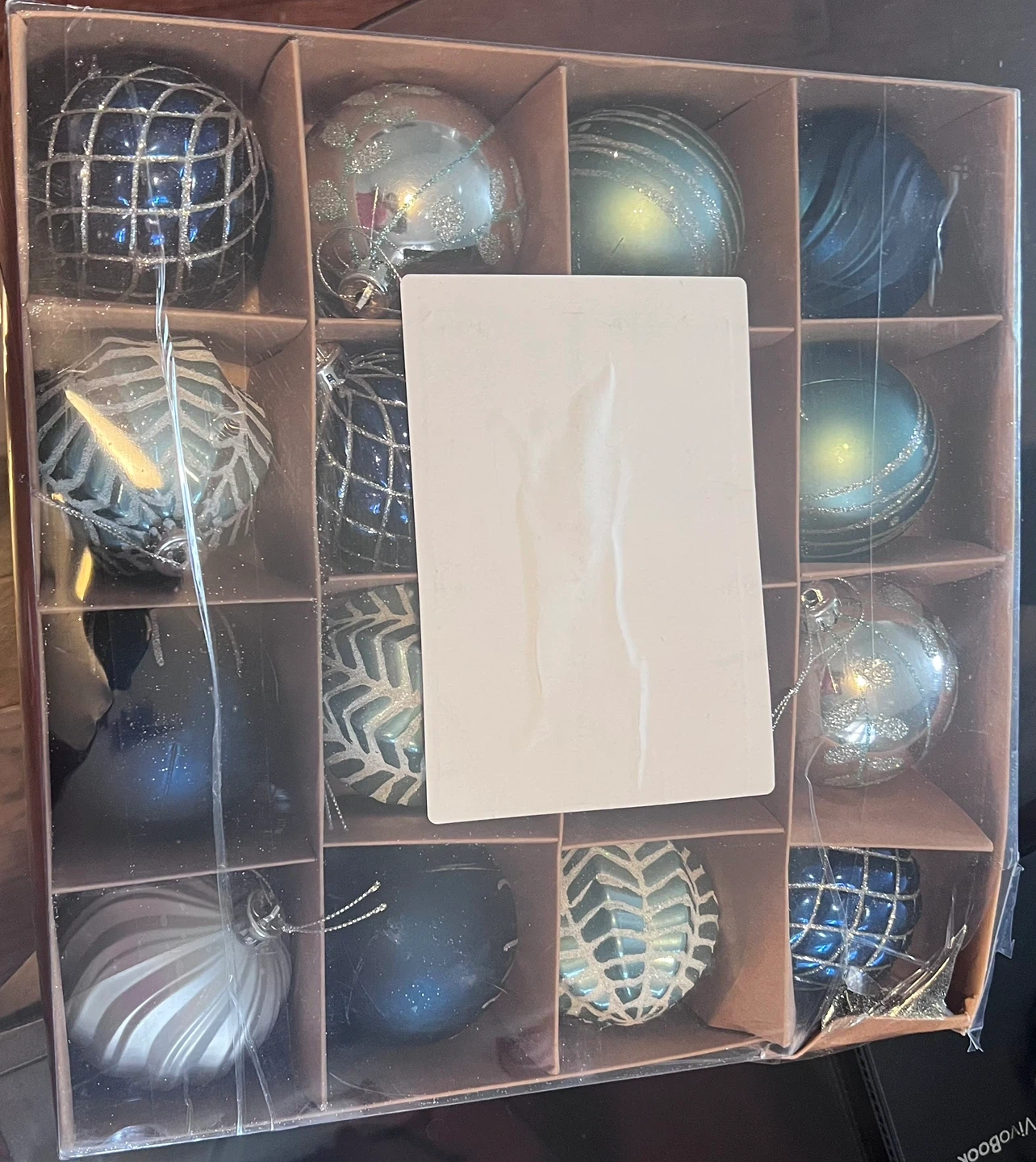 Selling a box of decorative Christmas ornaments. The box includes a variety of blue and silver ornaments with different patterns and designs. Perfect for adding a festive touch to your holiday decor this season