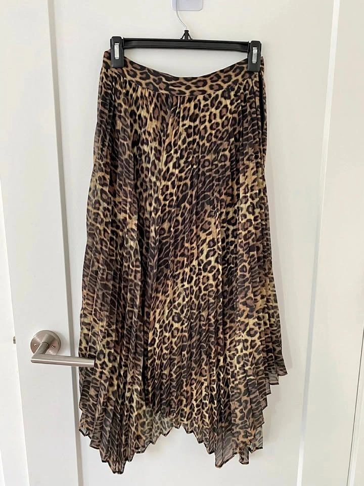 Kooples Leopard Print Midi Length Pleated skirt with Asymmetrical hem.