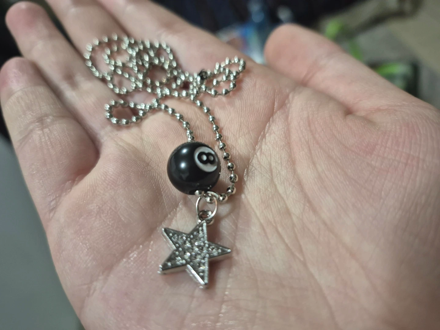 This is a set of two necklaces. One features a black 8 ball charm and a sparkling star pendant. The other has a black cat charm with crystal heart accents. Both have silver-toned chains.
