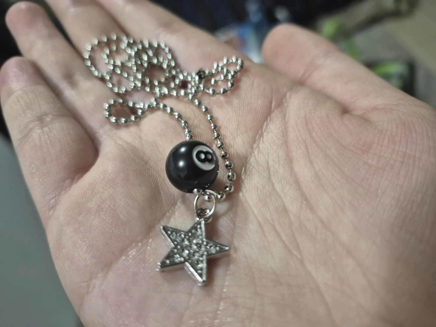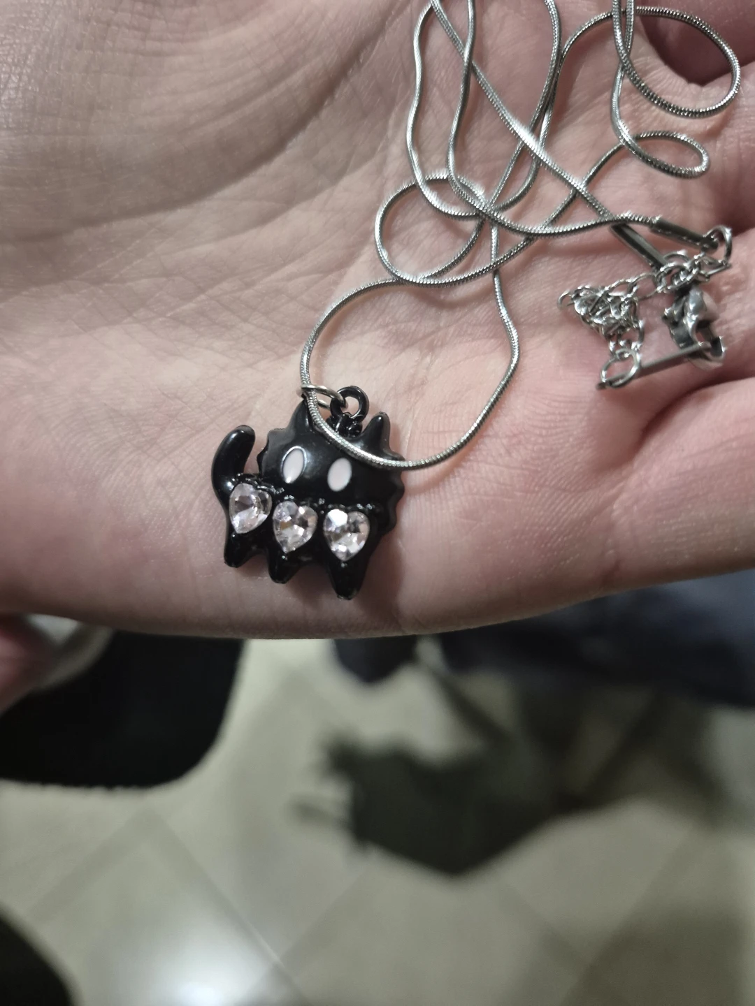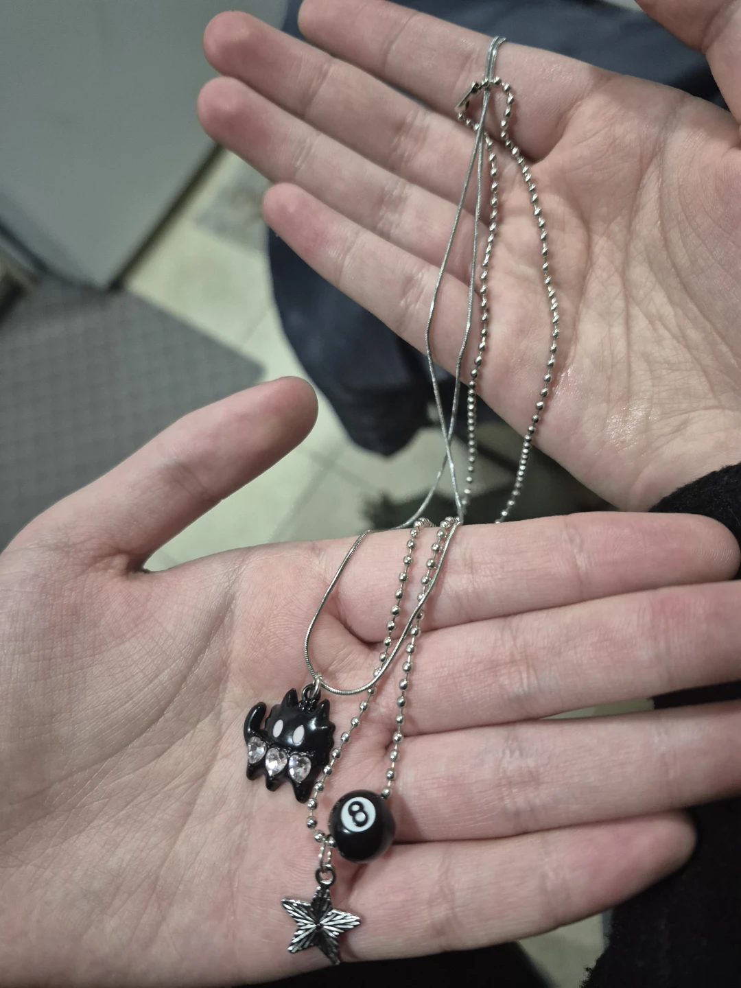 This is a set of two necklaces. One features a black 8 ball charm and a sparkling star pendant. The other has a black cat charm with crystal heart accents. Both have silver-toned chains.