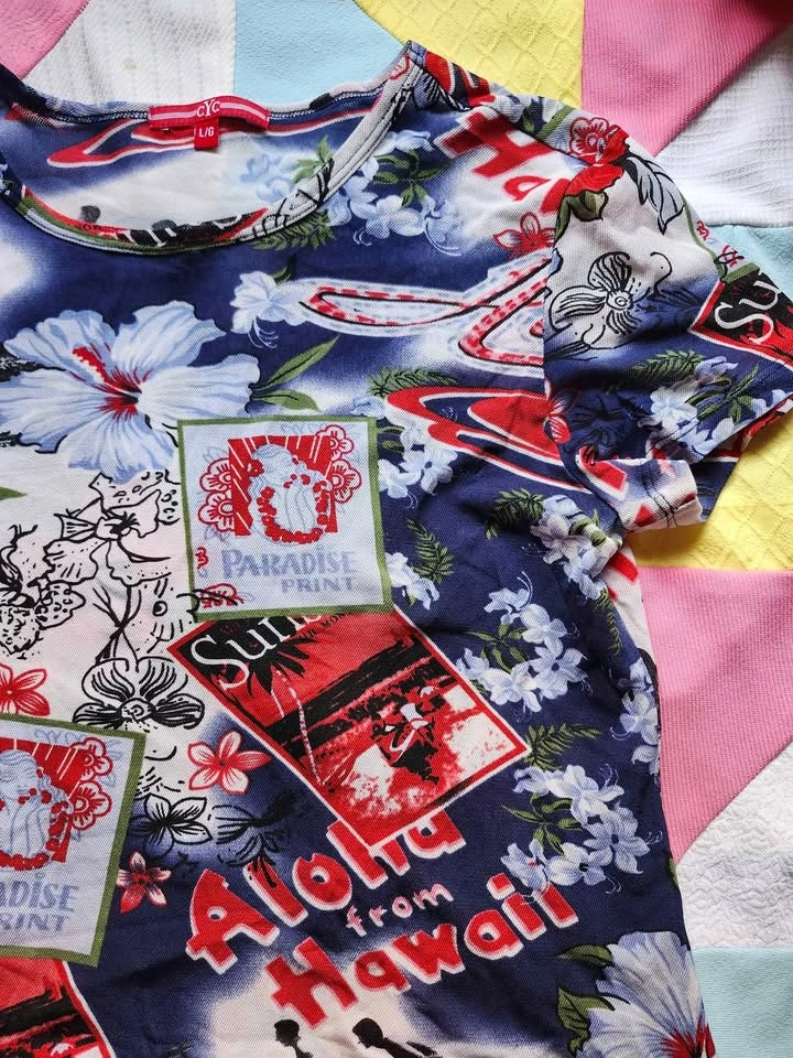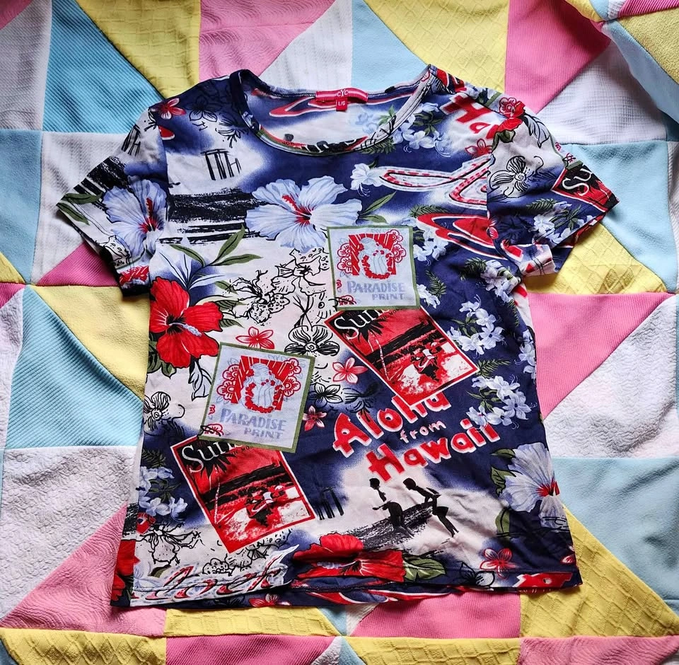 Adorable 2000s/90s Hawaiian mesh t-shirt by CYC. Super fun and summery.