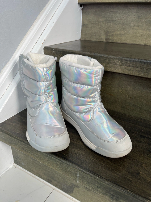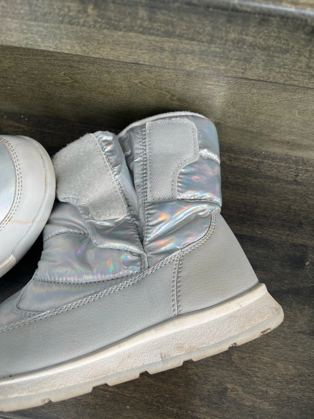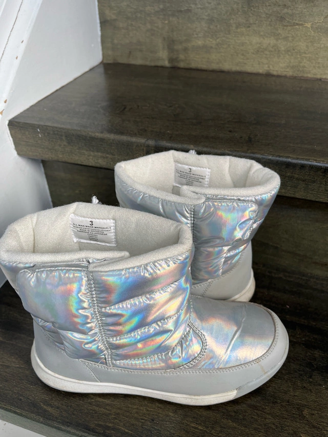 These are girls boots in size 3. They are a stylish silver colour and have a Velcro closure, very convenient for easy slip on and off. They're in mint condition, only worn 3 or 4 times for a couple of hours. Brand: Children’s Place.