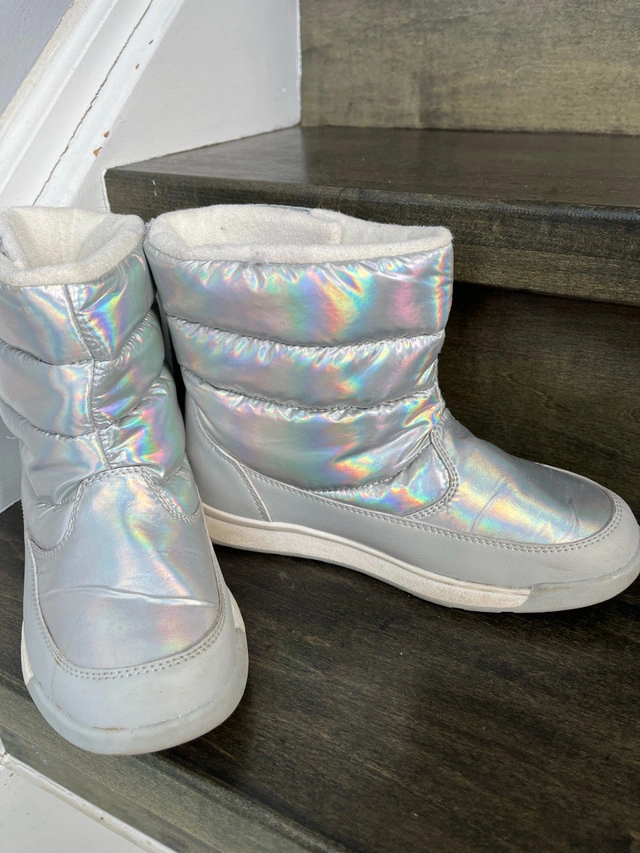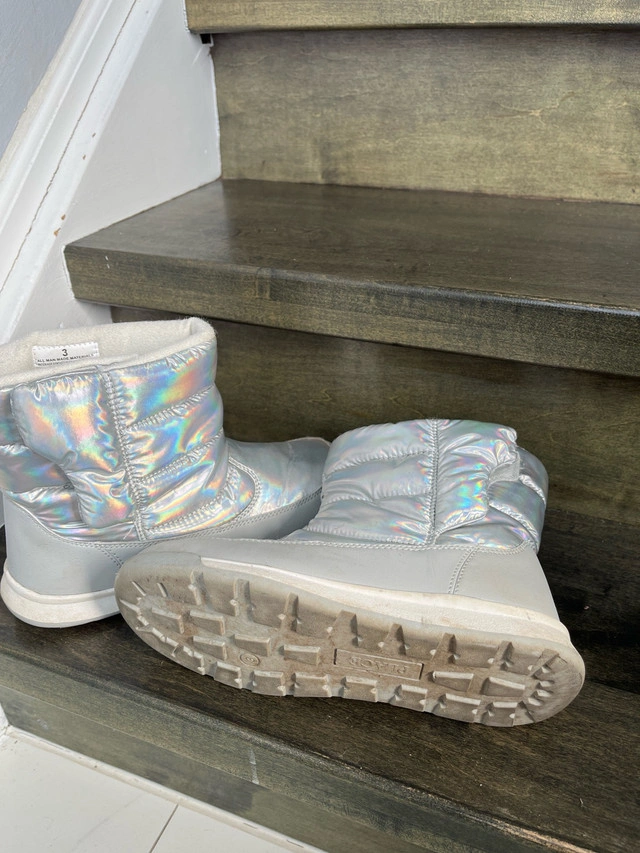 These are girls boots in size 3. They are a stylish silver colour and have a Velcro closure, very convenient for easy slip on and off. They're in mint condition, only worn 3 or 4 times for a couple of hours. Brand: Children’s Place.