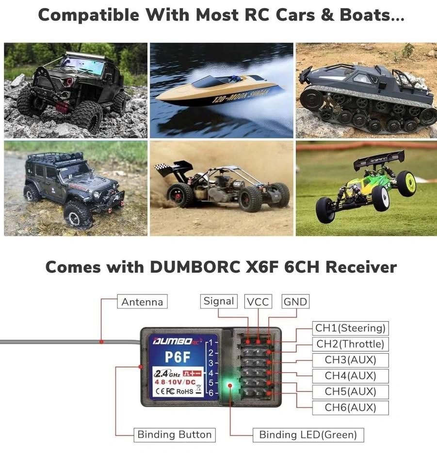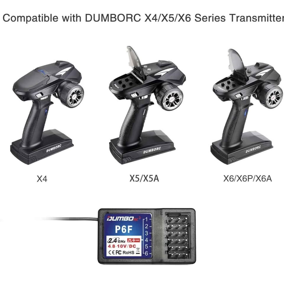 X6F 6CH receiver only compatible with DUMBORC X4/X5/X6 transmitter, suitable for rc vehicle and rc boat. Easy to bind, press the binding button for one second until the green indicator light is always on. You just need to bind with the controller for the first time. With reverse polarity protection circuit, the receiver will not be damaged even if the polarity is inserted. 4.8-10v DC support high voltage servo. With the FHSS spread spectrum, reduce the interference of the other radio system, provide 400 control distance and 12ms fast response speed. Small size: 35*20*13mm, fits most model size.