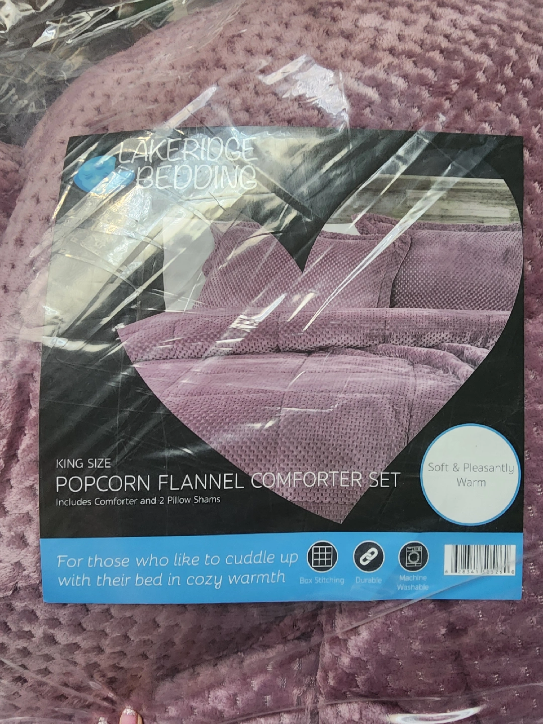 Snuggle up with this Lakeridge Bedding king size popcorn flannel comforter set! Includes a comfy comforter and two pillow shams. It's soft, pleasantly warm, durable, and machine washable. Perfect for those who like to cuddle up with their bed in cozy warmth!