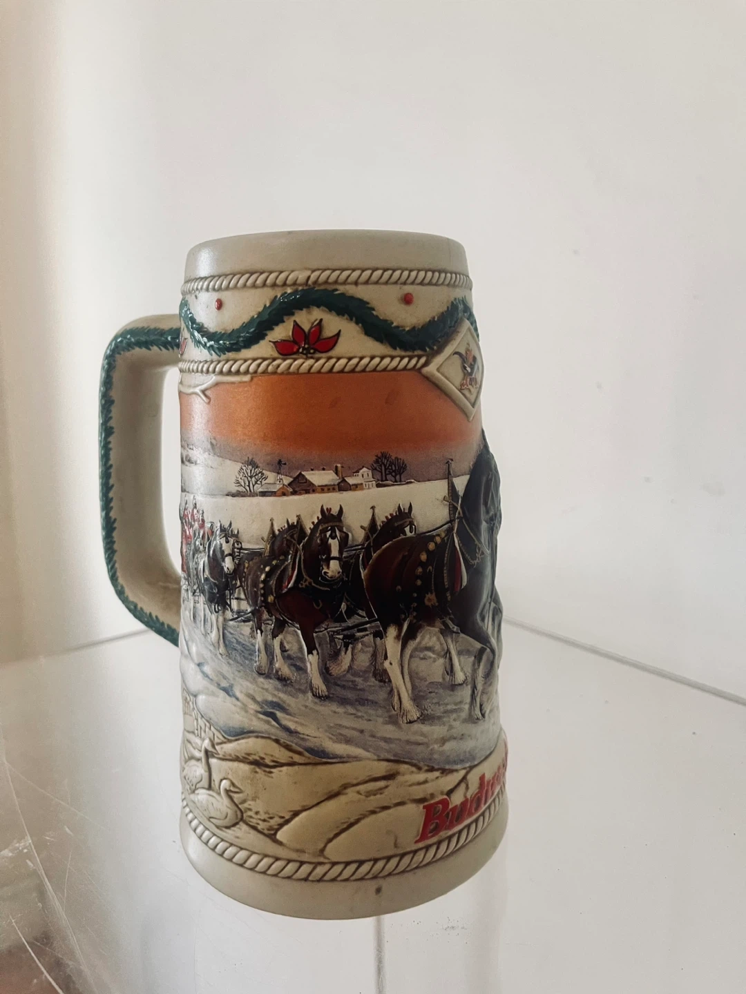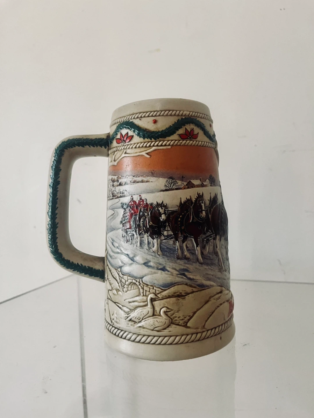 Selling a Budweiser 1996 Holiday Stein. It features a winter scene with horses and a red barn. The bottom of the stein indicates it was handcrafted expressly for Anheuser-Busch, Inc. by Ceramarte in Brazil. A great piece for any collector!