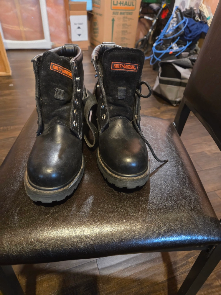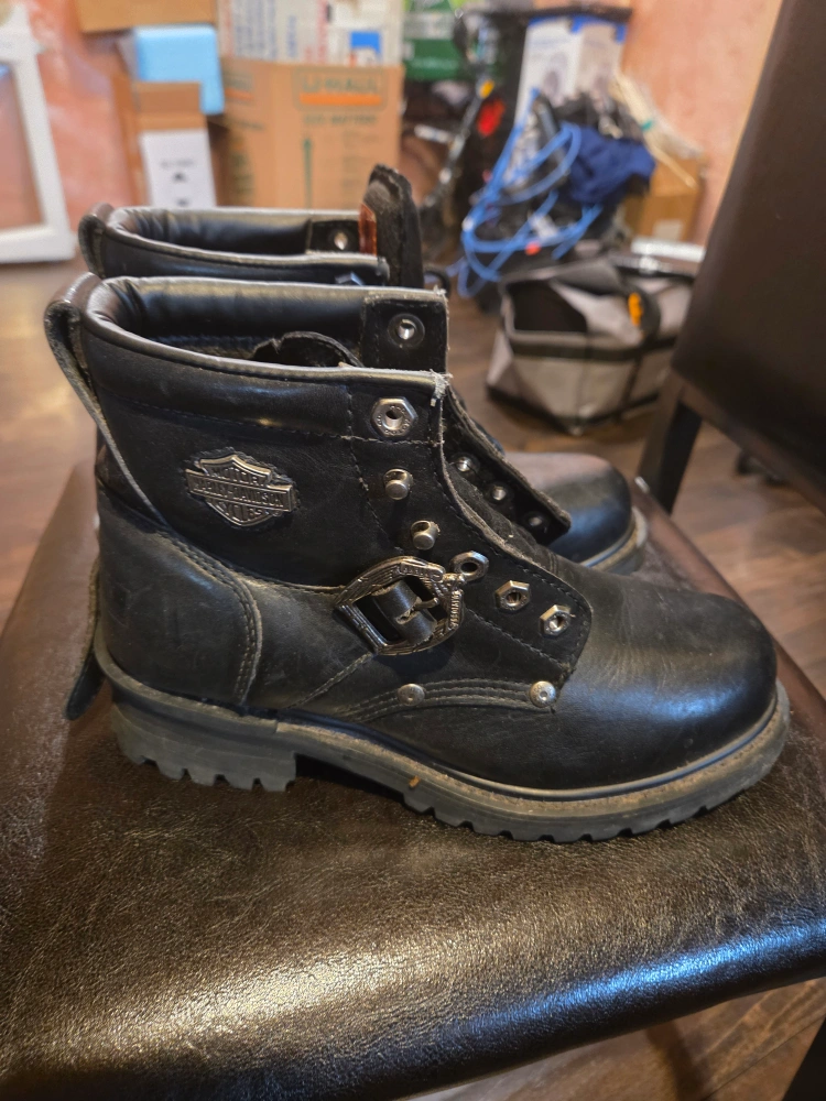 Selling a pair of Harley-Davidson black leather boots. They show some signs of wear, but are still in good condition for work or casual wear! Great for riding or everyday use.