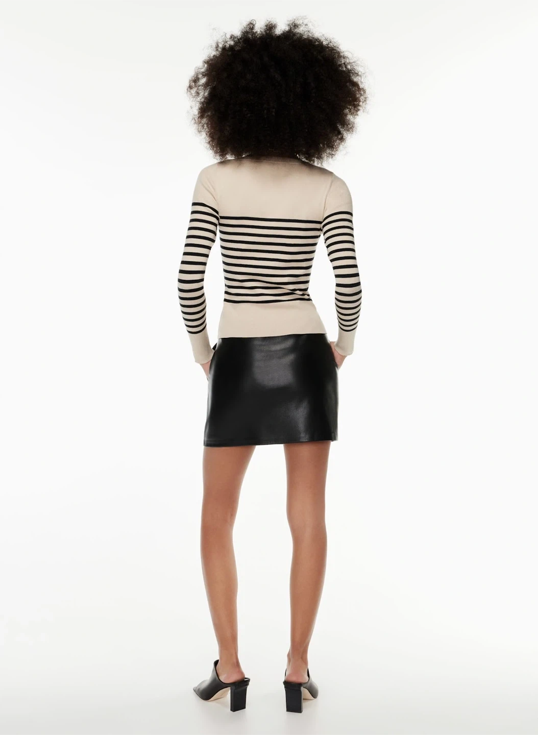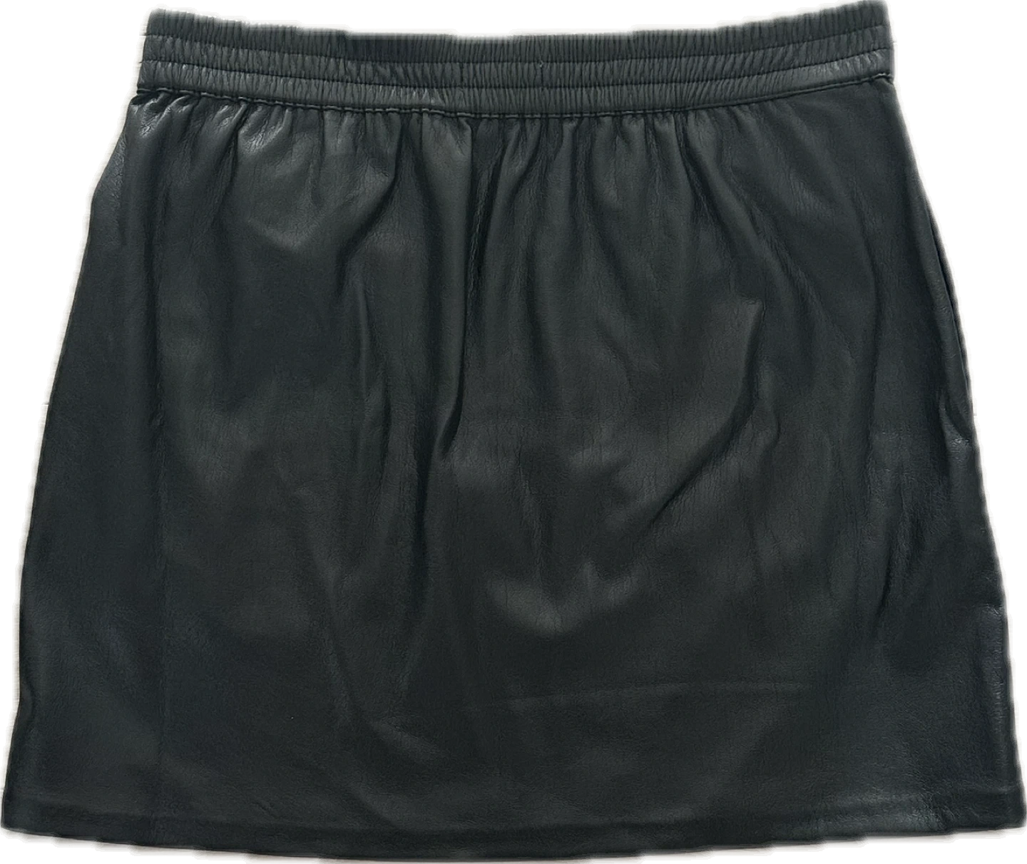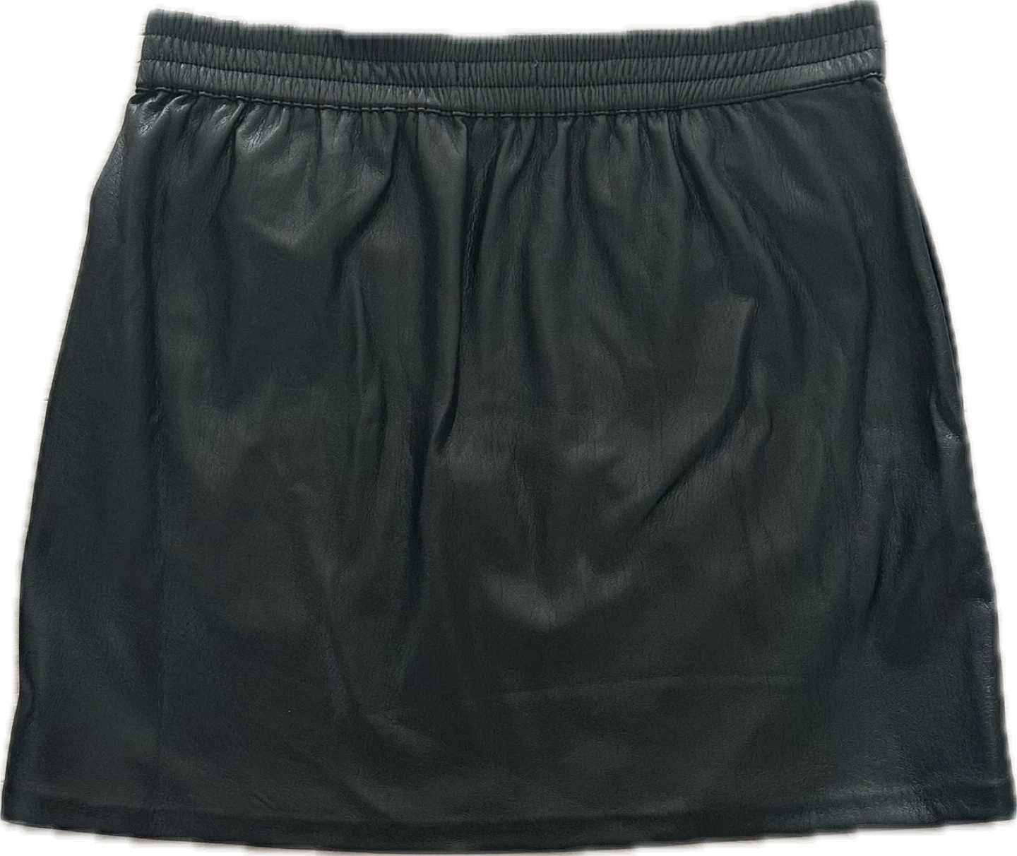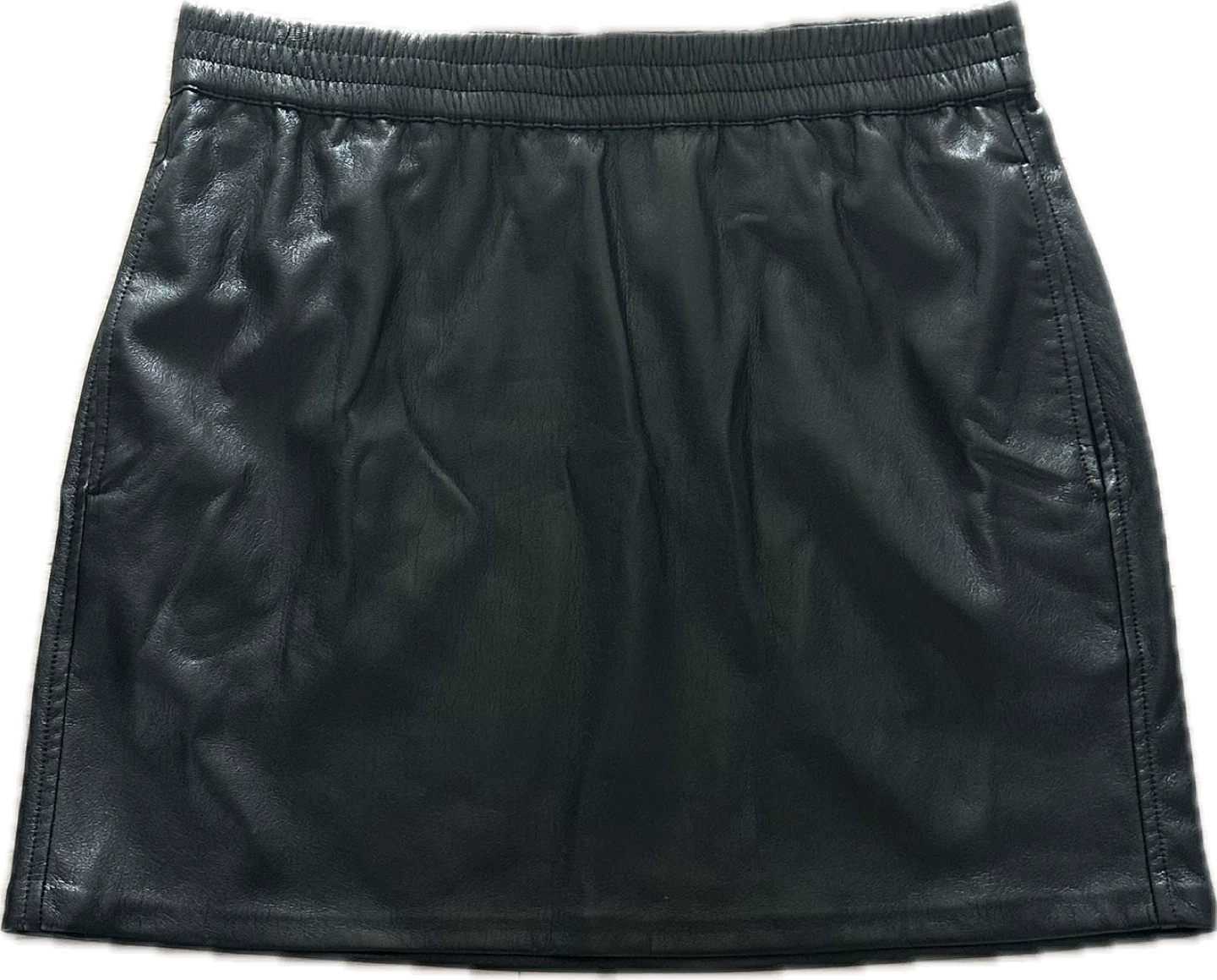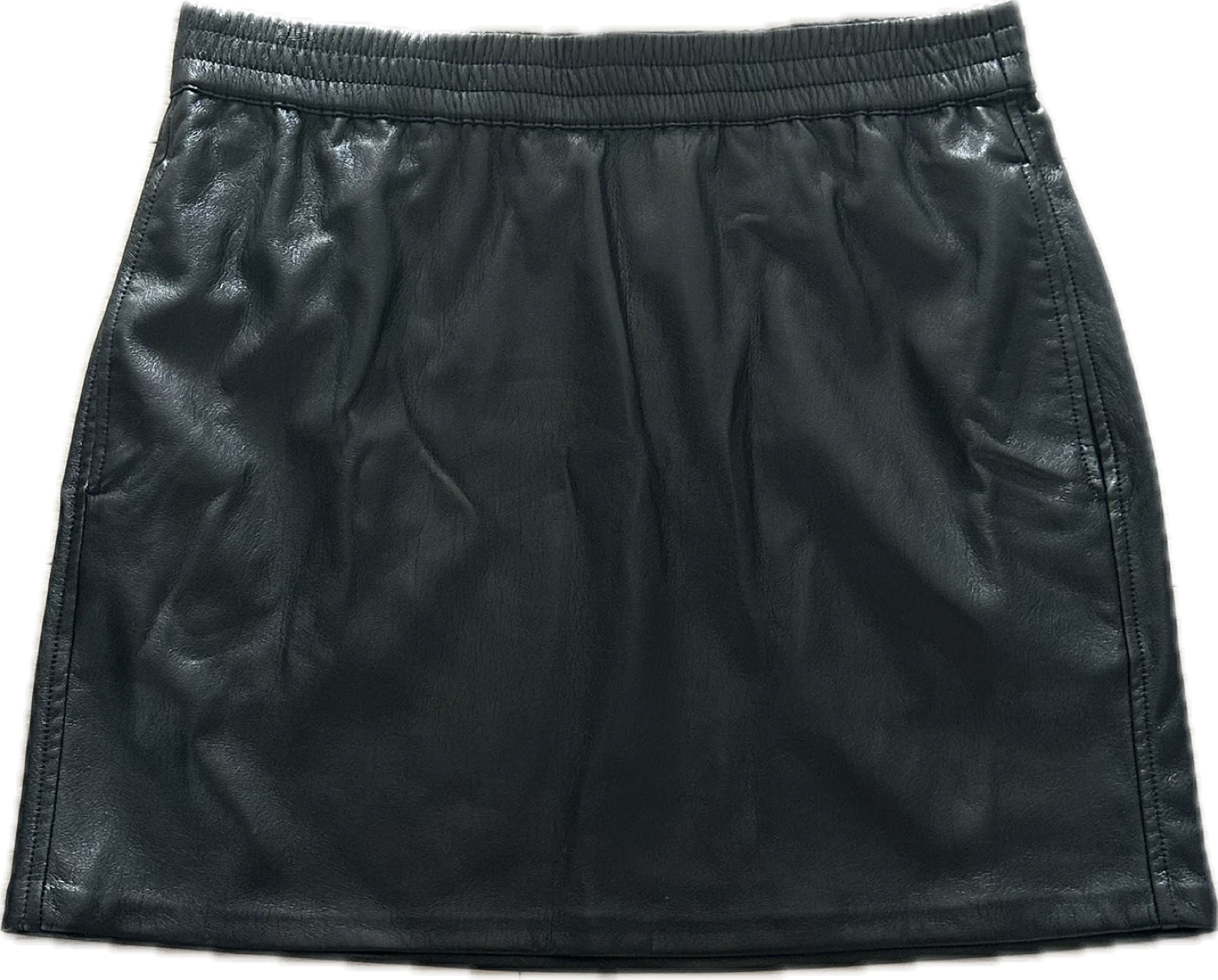 This is a mid-rise pencil skirt with an elastic waist and inseam pockets. It’s made with our innovative Vegan Leather that looks and feels like the real thing.