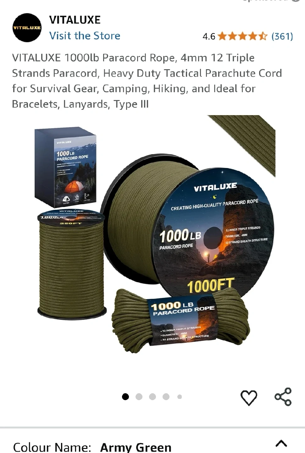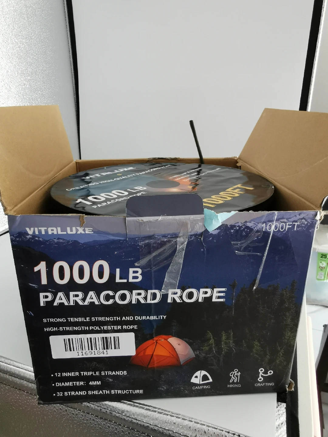 This is a new open box 1000ft (can't verify the exact length) spool of Vitaluxe 1000lb paracord rope with a 4mm diameter and 12 triple strands, ideal for various outdoor and crafting uses. Specifications: * Brand: Vitaluxe * Length: 1000 feet (note: can't verify) * Weight Capacity: 1000 lbs * Diameter: 4mm * Strands: 12 Triple Strands * Colour: Army Green This high-quality paracord is perfect for camping, hiking, survival gear, bracelets, lanyards, and more. It offers strength and durability for any task you have in mind. Just so you know, if the ad's still up, the rope's still available – no need to ask! Happy adventuring! Pickup at Bur Oak @ McCowan Markham, or at 70 Queens Wharf Rd, downtown Toronto around noon most of Sundays