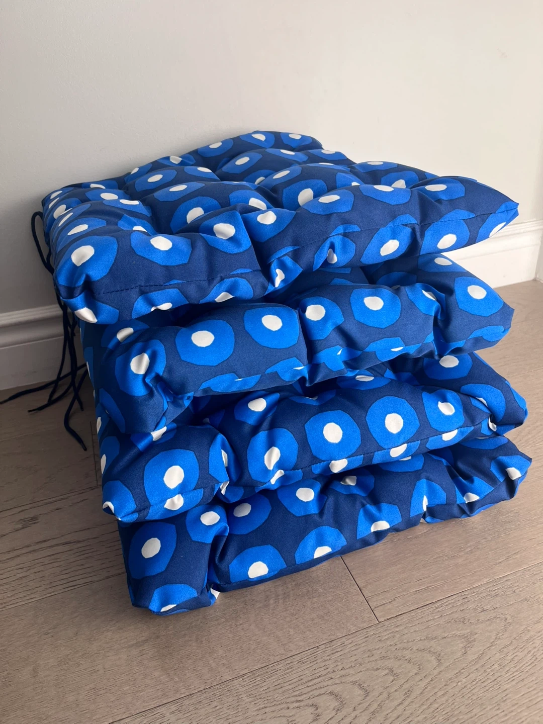 227Selling a set of four IKEA KLÖSAN seat cushions in a vibrant blue and white pattern! Meant for use outdoors but could be used indoors. Each cushion measures 44x44 cm (17 3/8 x 17 3/8")