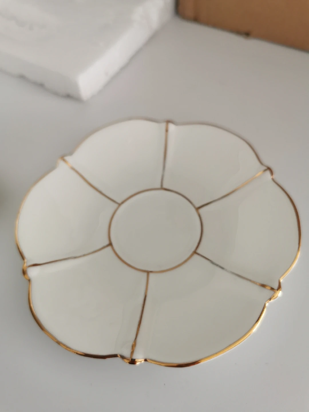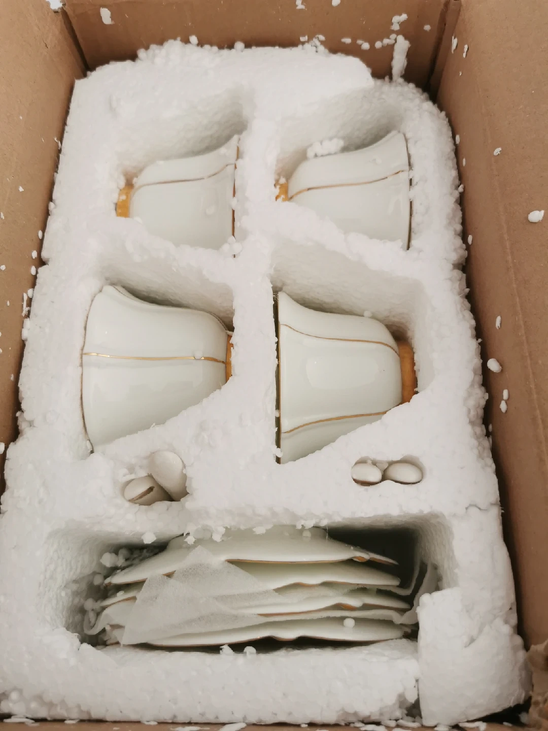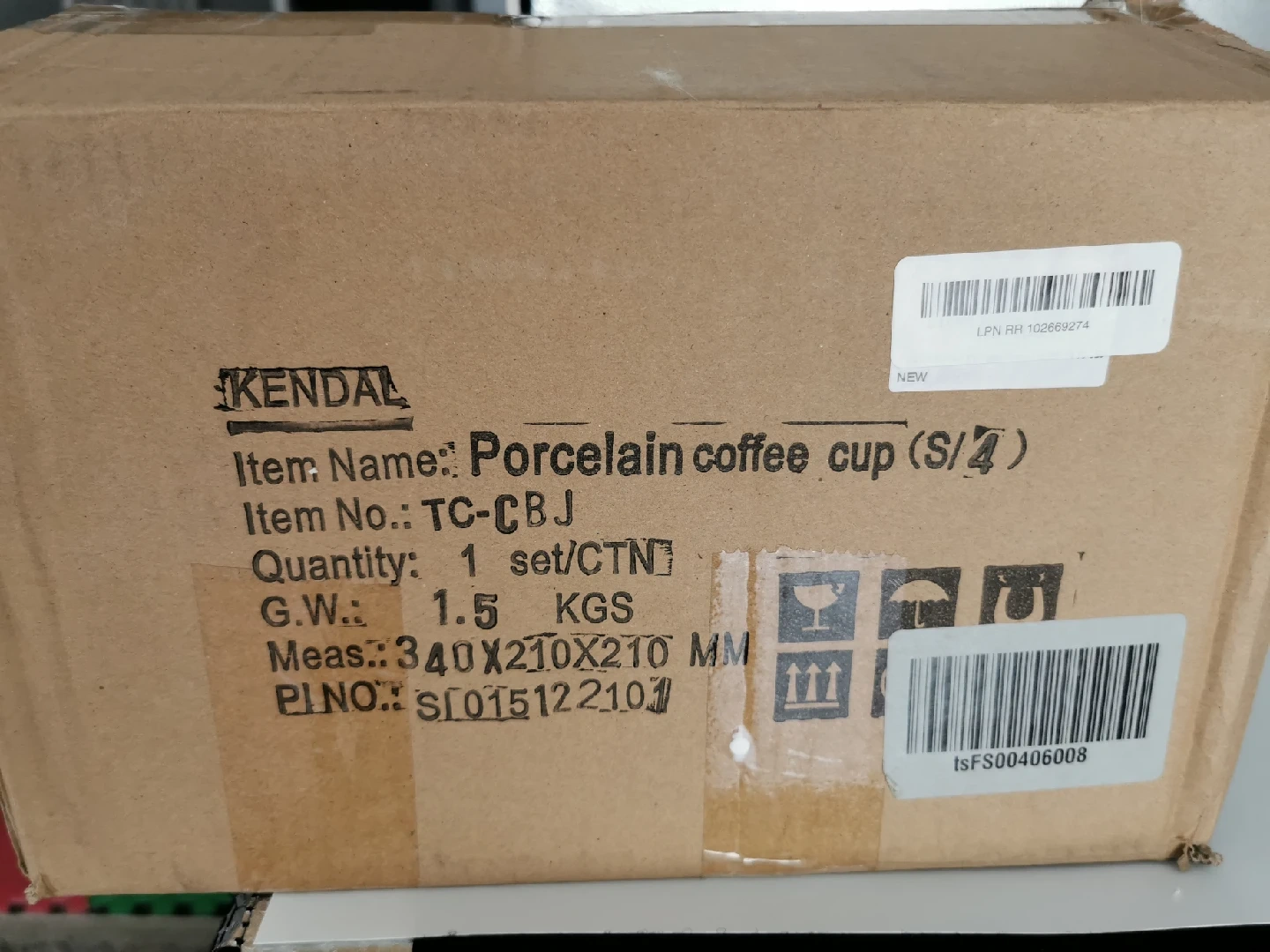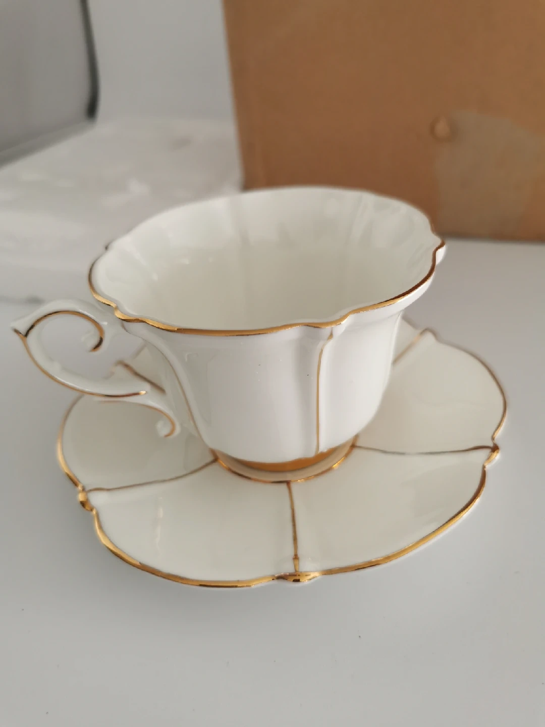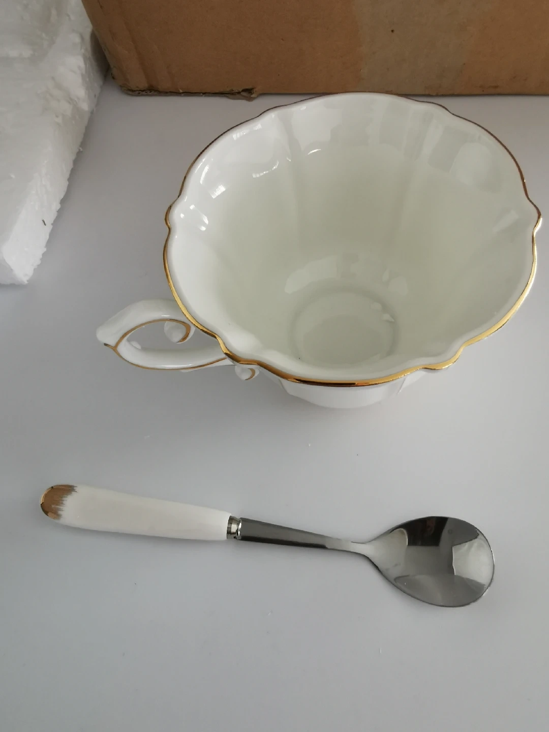 This Kendal porcelain coffee cup set includes 4 cups, 4 saucers, and 4 spoons, new open box in the original box. The cups and saucers are white with gold trim, perfect for adding a touch of elegance to your tea or coffee time.