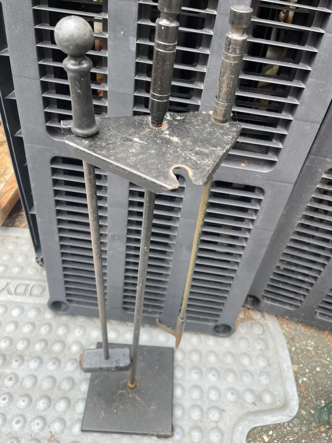 Selling a used fireplace tool set. It includes a stand and two tools. It is in used condition.