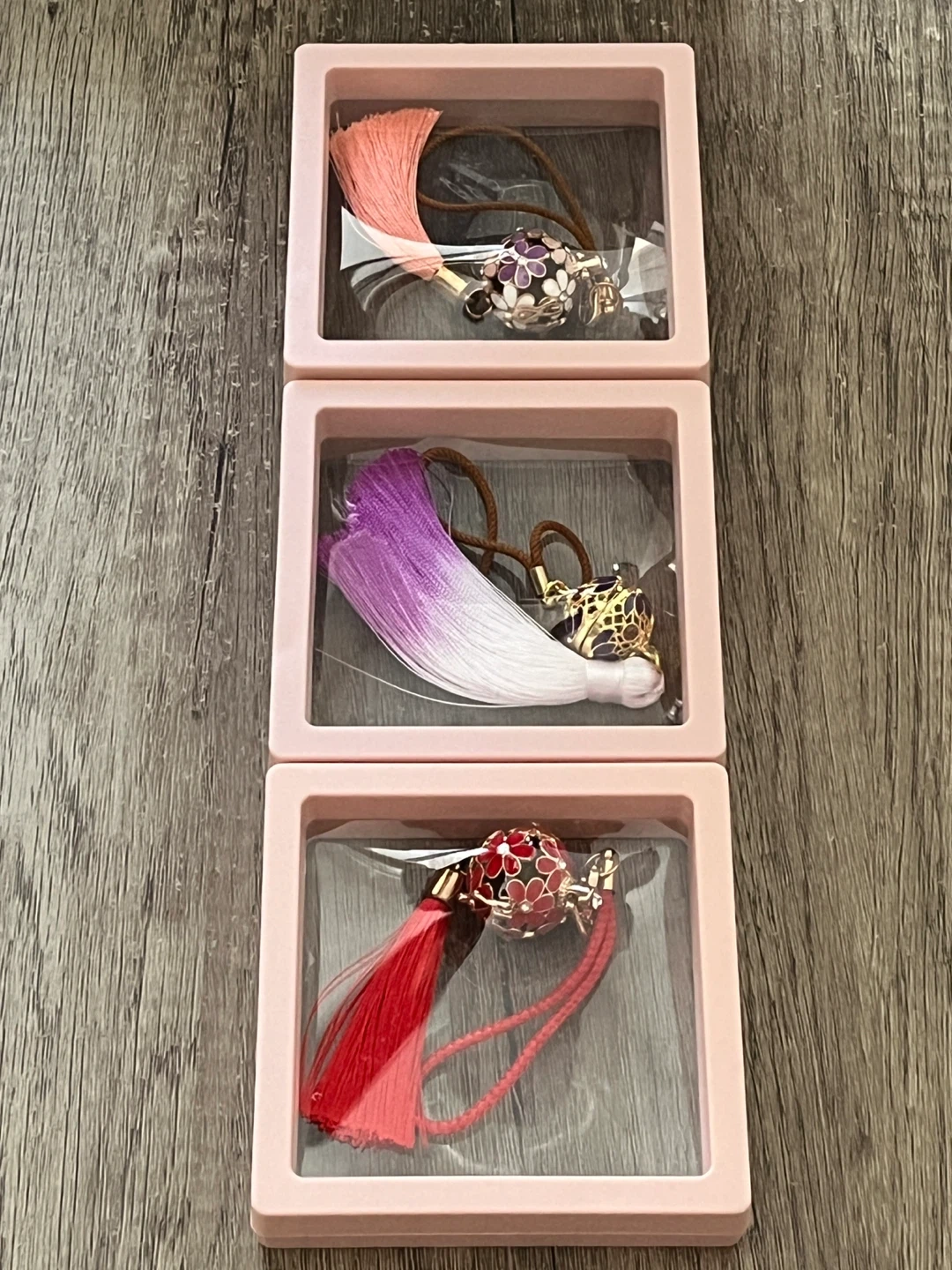 $9 each or take all 3 for $25. Selling a set of three decorative tassels, each in its own display box. They feature different colour tassels with a decorative ball accent. Perfect for adding a touch of elegance to your home decor!