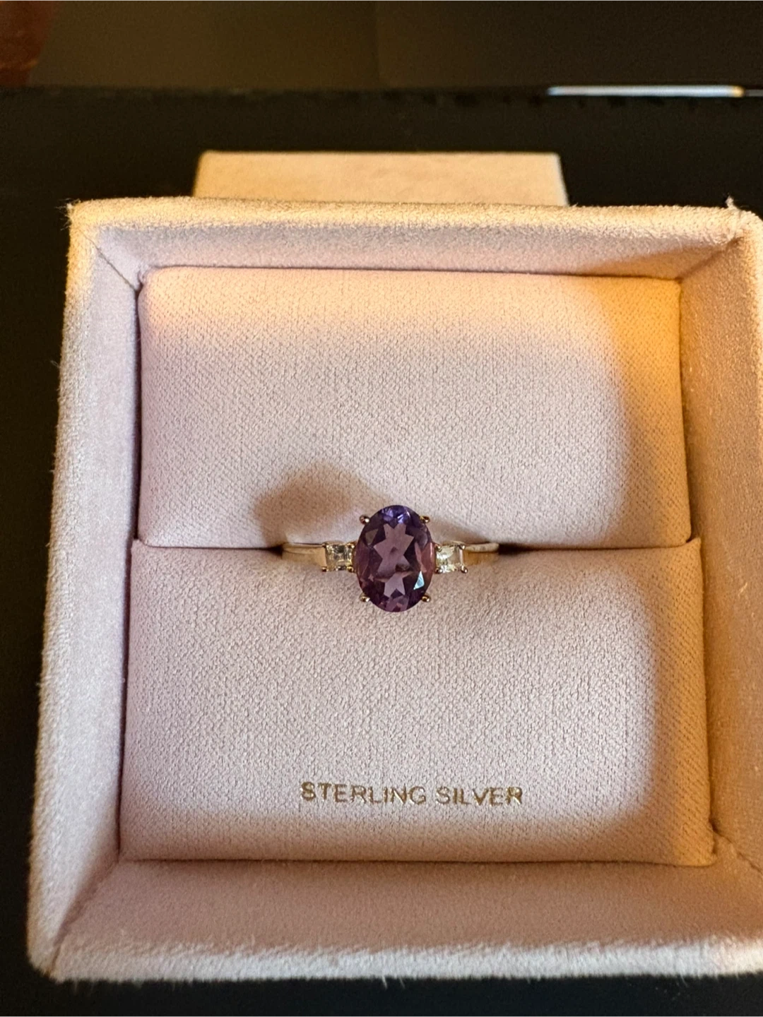 Selling a beautiful rose gold ring featuring a lovely amethyst stone. It's in excellent condition and comes in its original box. The ring has a classic and elegant design, perfect for any occasion! It was given to me as a gift, and has never been worn.