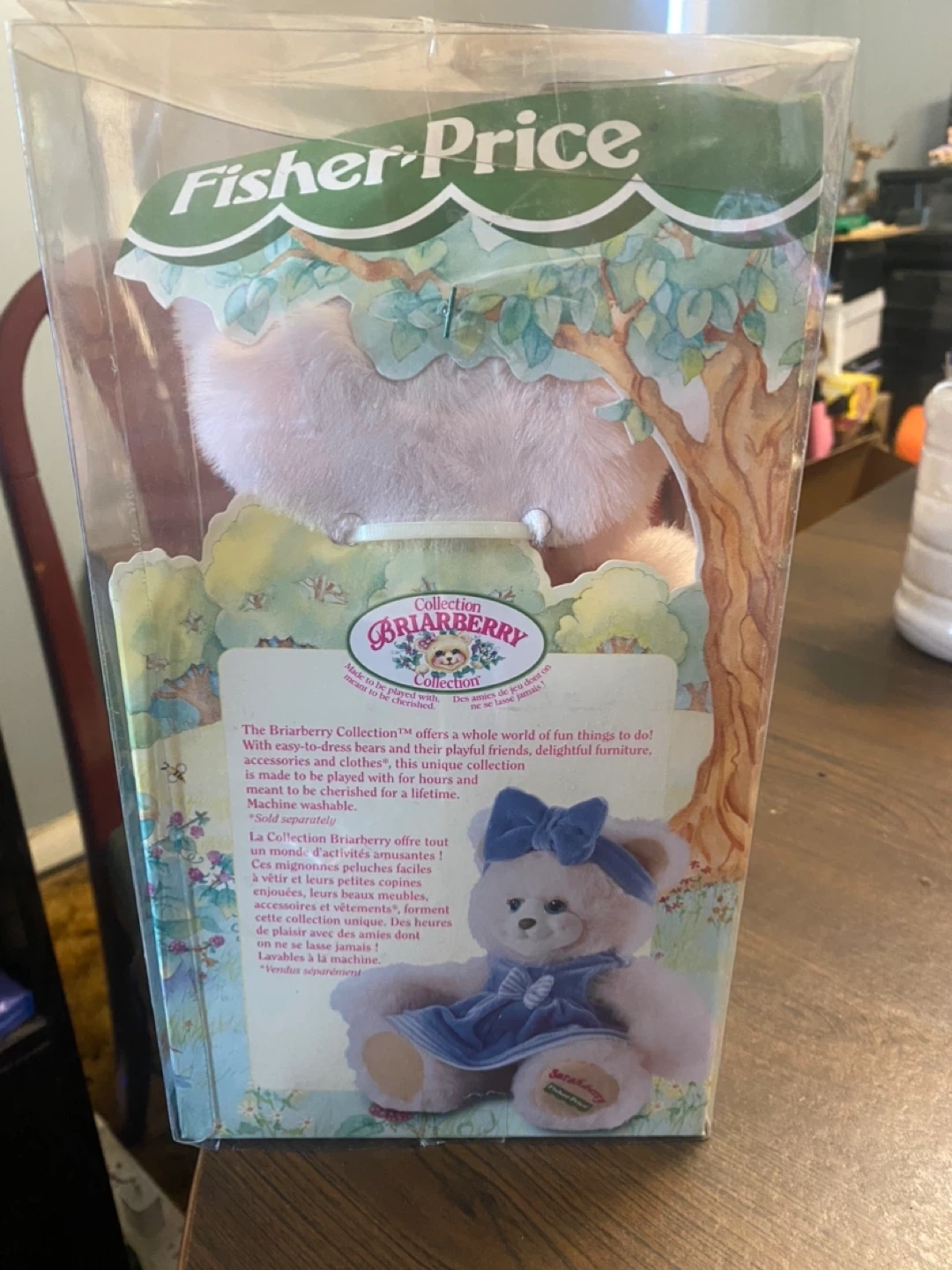 This vintage Fisher-Price Sarahberry bear from the Briarberry Collection is a delightful find! This adorable plush bear, still in its original packaging, is ready to bring a touch of nostalgia and charm to any collection. The box has some wear, but the bear is in excellent condition.