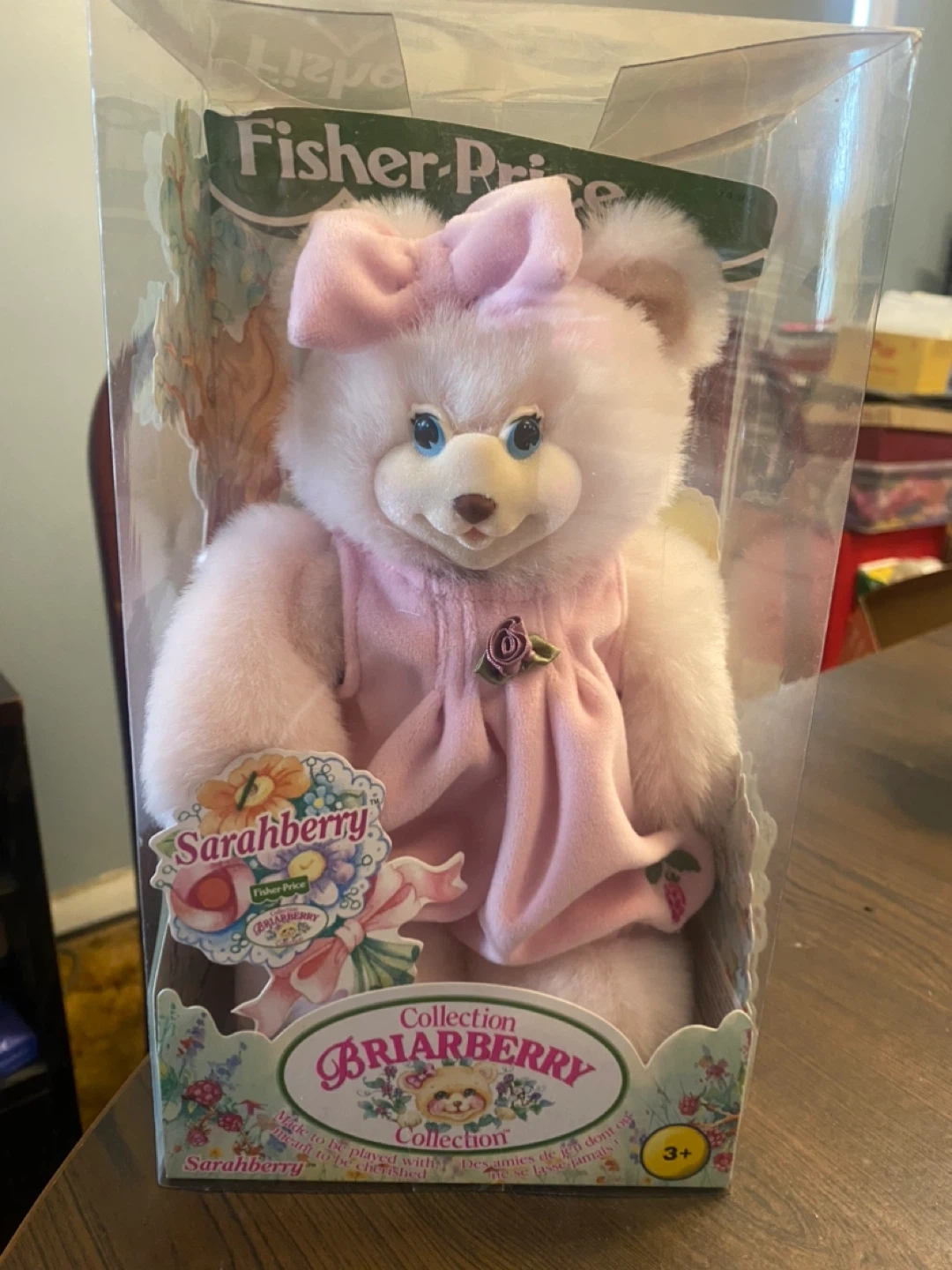 This vintage Fisher-Price Sarahberry bear from the Briarberry Collection is a delightful find! This adorable plush bear, still in its original packaging, is ready to bring a touch of nostalgia and charm to any collection. The box has some wear, but the bear is in excellent condition.