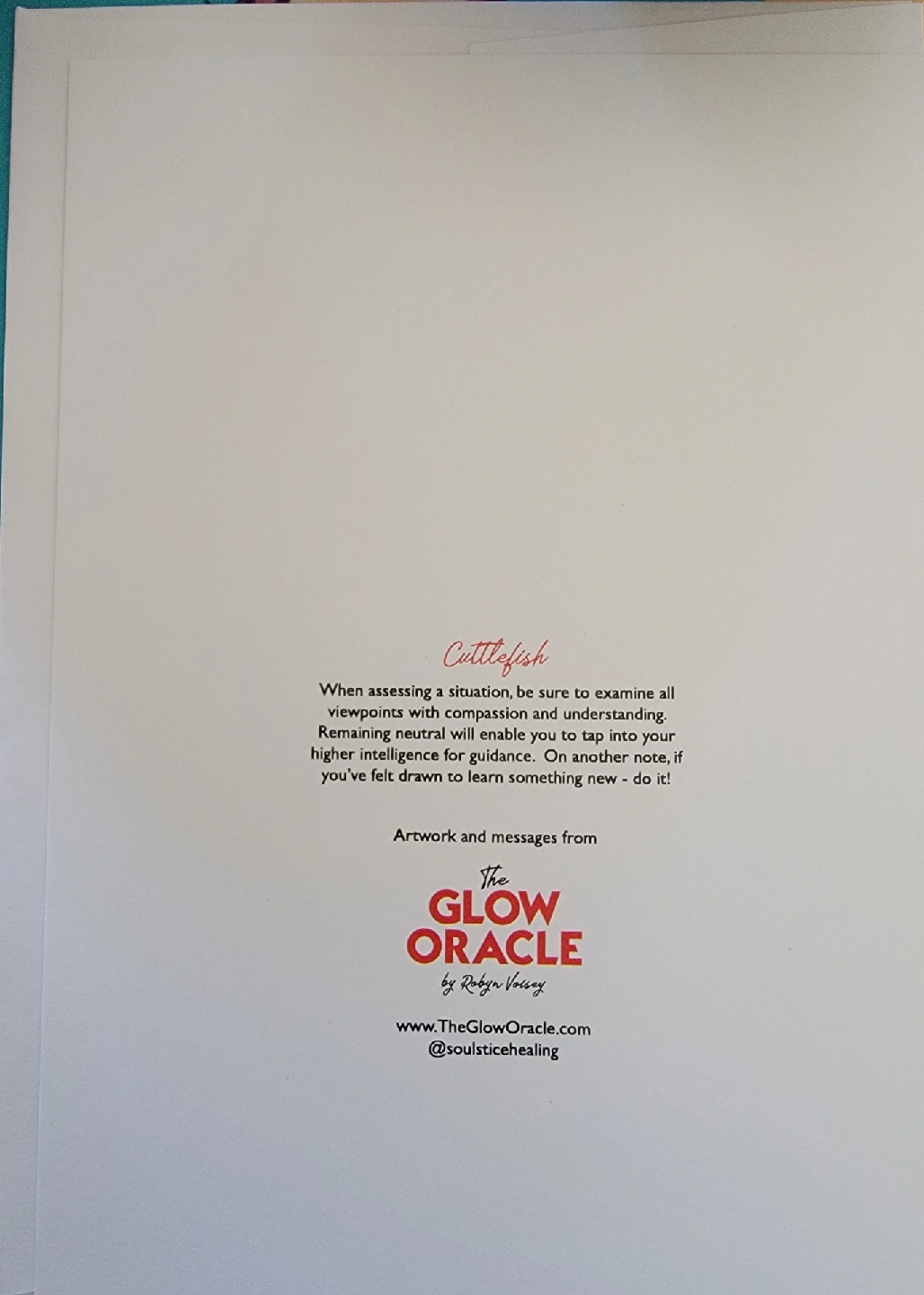 Cuttlefish card from The Glow Oracle deck! It's in great condition and features beautiful artwork and messages for guidance. Artwork and messages are from The Glow Oracle by Rudnya Vessey.