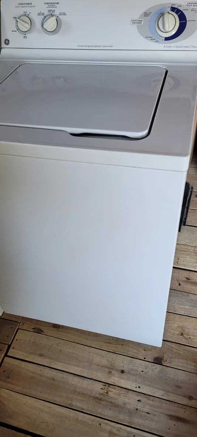 Selling a GE top-load washing machine! It's in good working condition and ready to help with your laundry needs. Features include various load/charge settings, temperature controls, and cycle options for different fabrics. Perfect for a small family or apartment!