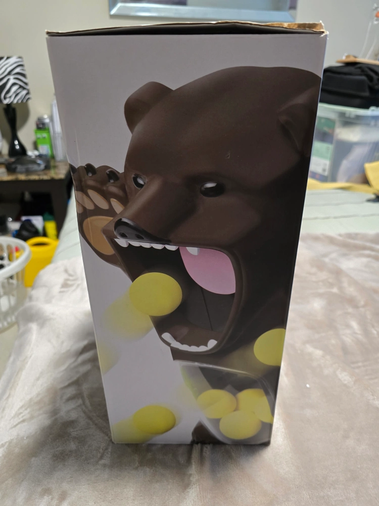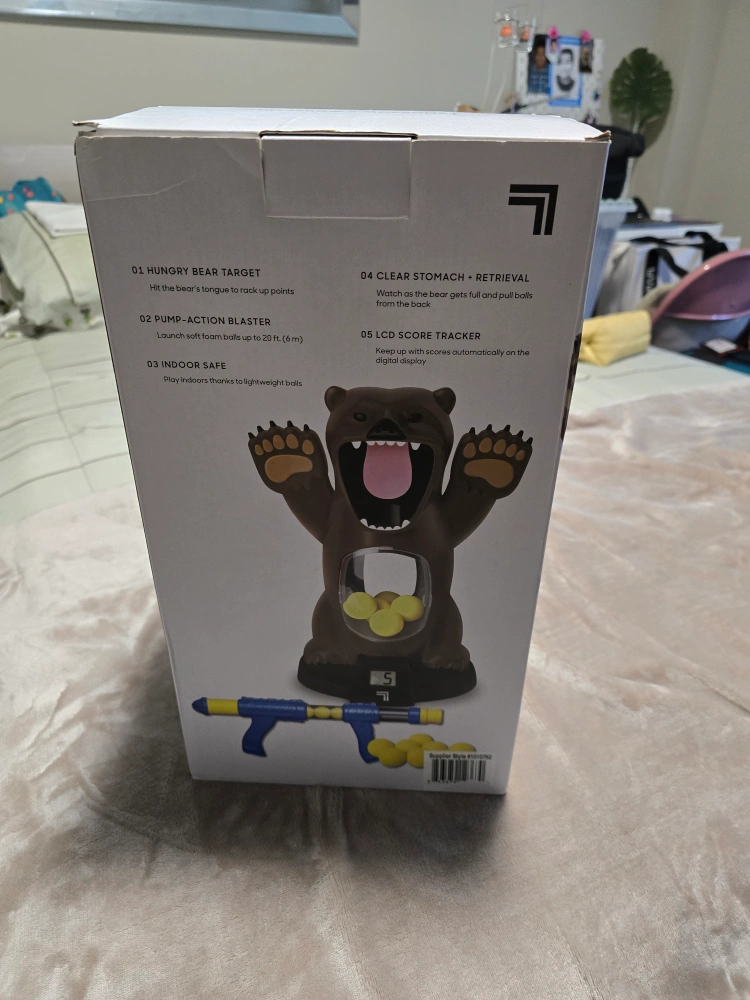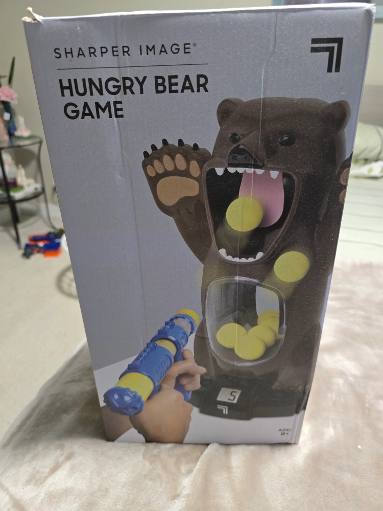 19I have a good Sharper Image Hungry Bear Target Game still in its original box! It's a fun indoor safe game that includes a pump-action blaster to launch soft foam balls up to 25 ft (6 m). Hit the bear's tongue to rack up points, and the clear stomach lets you retrieve the balls easily. Keep up with your score automatically on the LCD score tracker!